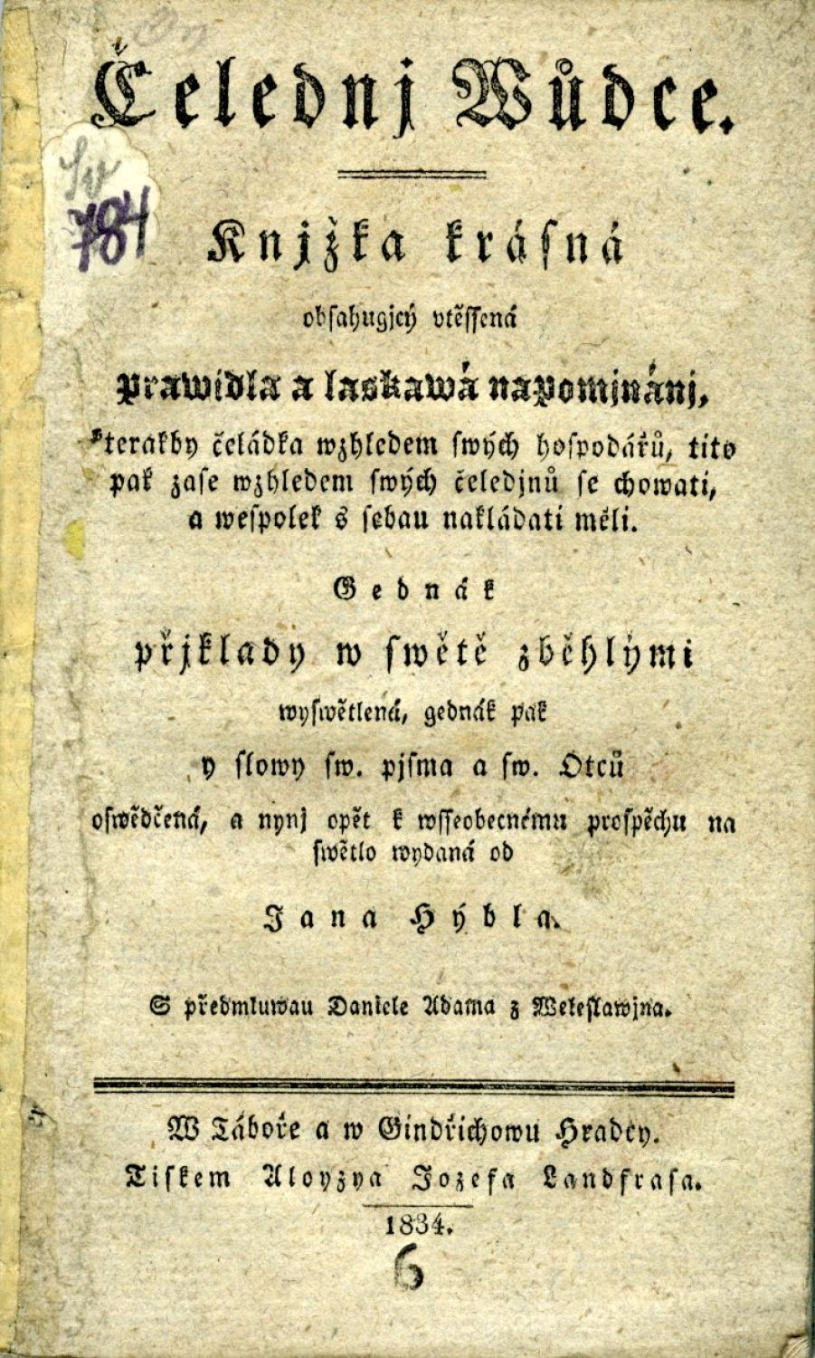 Čelednj Wůdce. Knjžka krásná obsahugjcý utěssená Prawidla a laskawá napomjnánj, kterakby čeládka wzhledem swých hospodářů, tito pak zase wzhledem swých čeledjnů se chowati, a wespolek s sebau nakládati měli. Gednák přjklady w swětě zběhlými wyswětlená, gednák pak y slowy sw. pjsma a sw. Otců oswědčená, a nynj opět k wsseobecnému prospěchu na swětlo wydaná od Jana Hýbla.