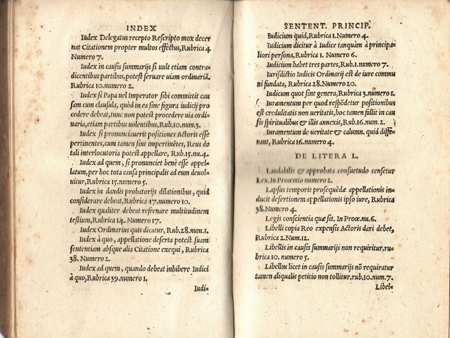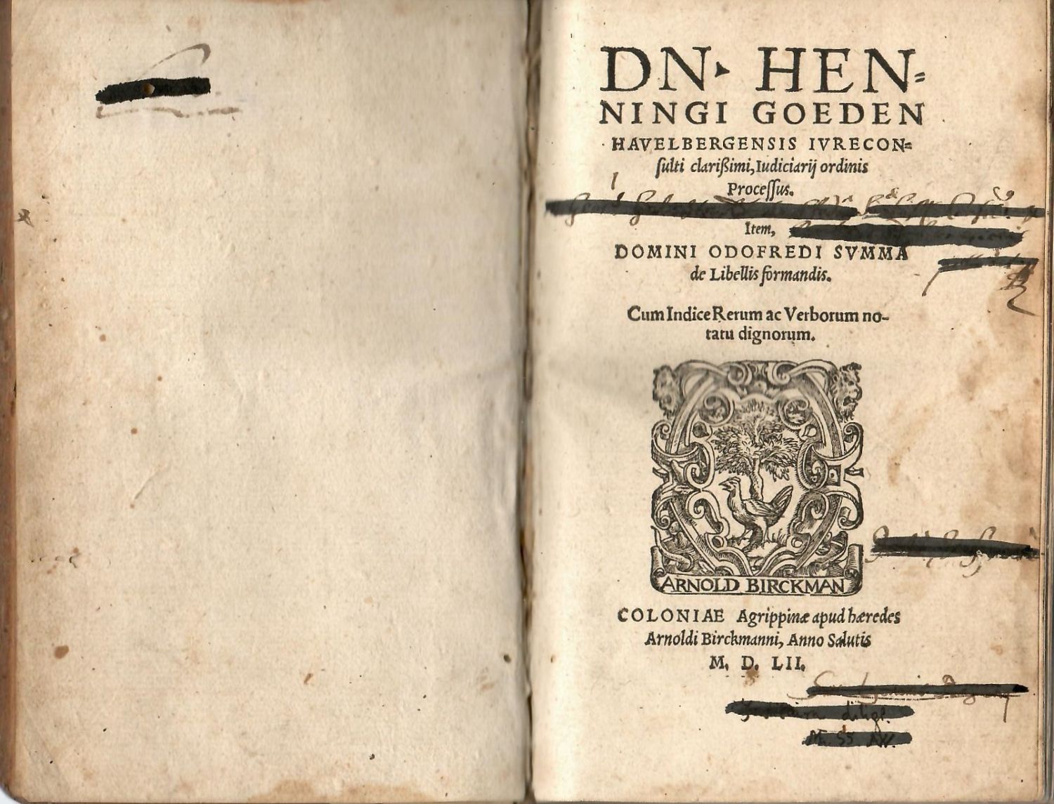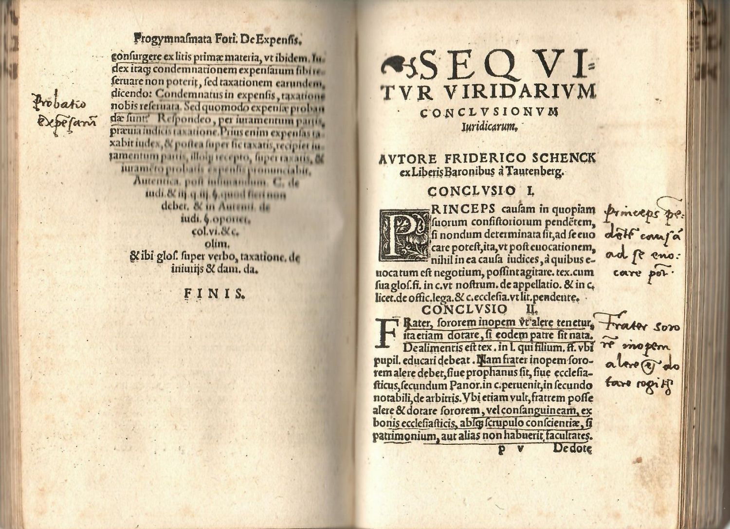 + přívazek: Schenck zu Tautenberg, Friedrich "PROGYMNASTA FORI, SEV DE IIS QVI IN IVDICIO uersantur, et de actis Ciuilium Iudiciorum LIBRI DUO. Item , VIRIDARIVM CONCLVSIOnum Iuridicarum". Köln, Arnold Birckmann, 1552, 176 nepagin. listů (rub posledního nepotištěný), na tit. listu signet nakladatele, živá záhlaví, tučně tištěné versálky ve výši 3 řádků, dvě konturové iniciály na rostlinném pozadí zalomené do výše 5 řádků. Na foliu P-5 název druhé části "SEQVITVR VIRIDARIVM CONCLVSIONVM Iuridicarum".