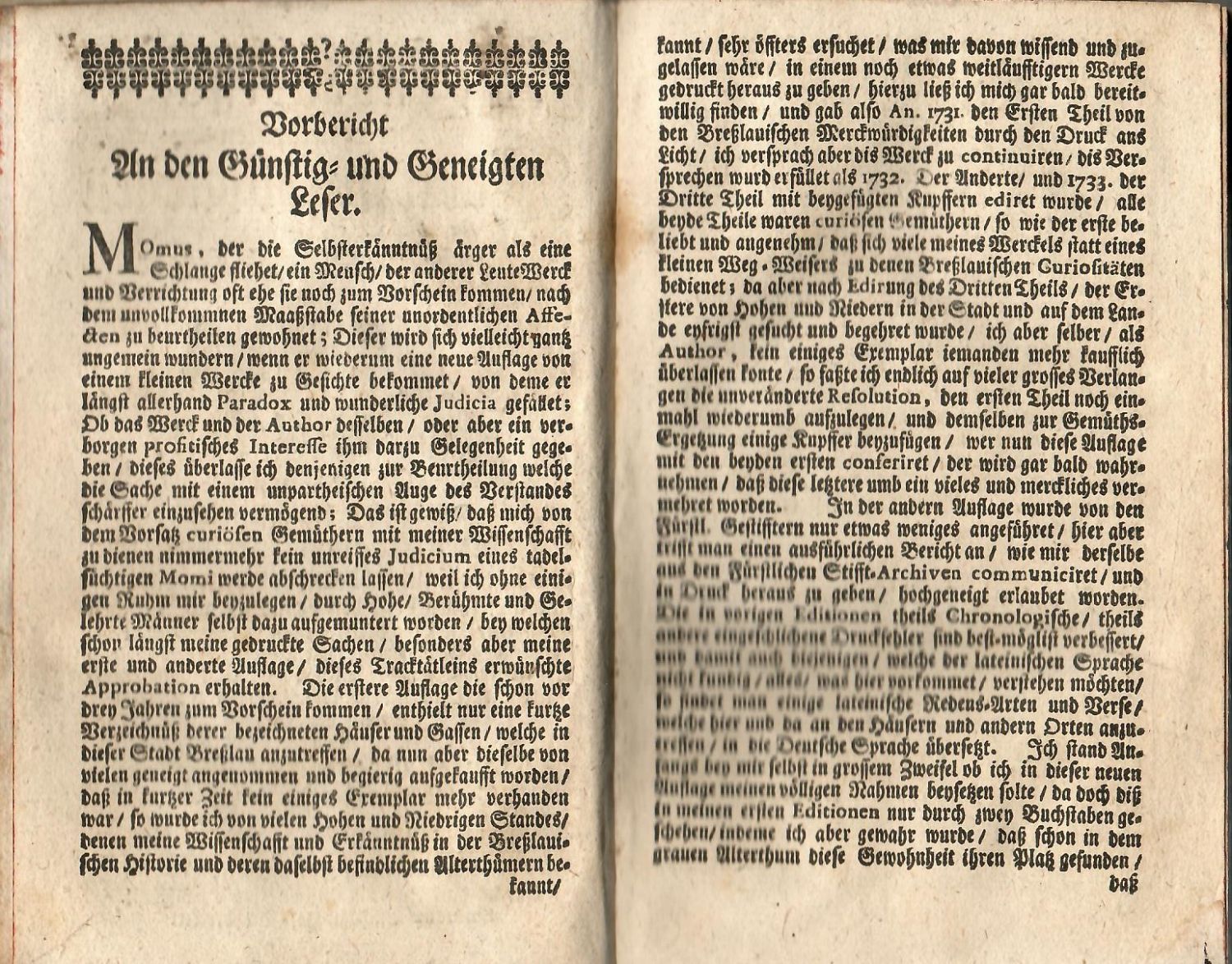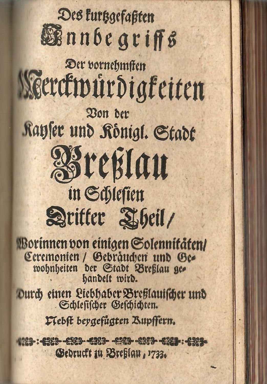 Tištěno švabachem, latinský text antikvou, arabská paginace stran uprostřed horního okraje v kulatých závorkách mezi drobnými lístky od sazby oddělená jednoduchou linkou, vstupní pásové vlysy, koncové viněty. Tři samostatné titulní listy. I. díl "Von deren Erbauung, Erweiterung und Bevestigung, dann von denen darinn = und ausserhalb derselben befindlichen Fürstlichen Gestisstern, Klöstern, Pfarr=Kirchen und Capellen, deren Fundirung und Erbauung samt andern mehreren curiösen Nachrichten, alles aus bewährten Autoribus, Documenten, .... II. díl: "Worinnen dasjenige, wasa im ersten Theile entweder gar nict, oder unvollkommen stehet, naceholet wird, Durc einen Liebhaber Bresslanischer und Schlesischer Geschichten", III. díl: "Worinnen von einigen Solennitäten, Ceremonien, Gebräuchen und Gewohnheiten der Stadt Bresslau gehandelt wird".