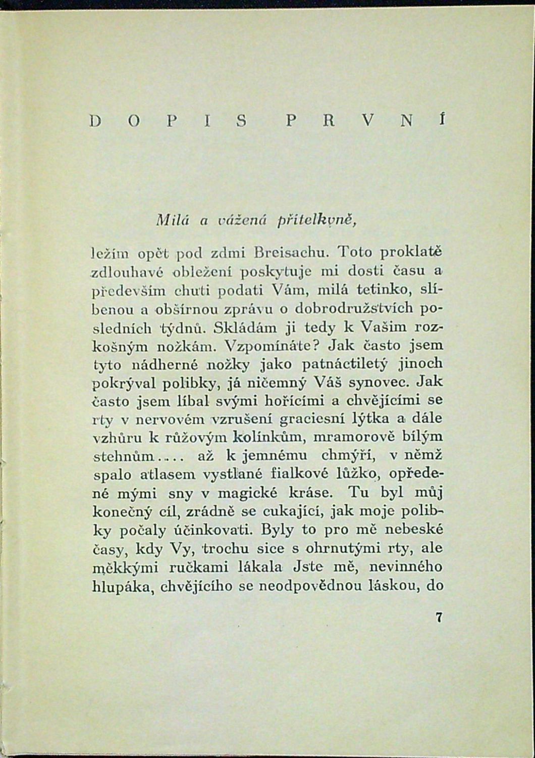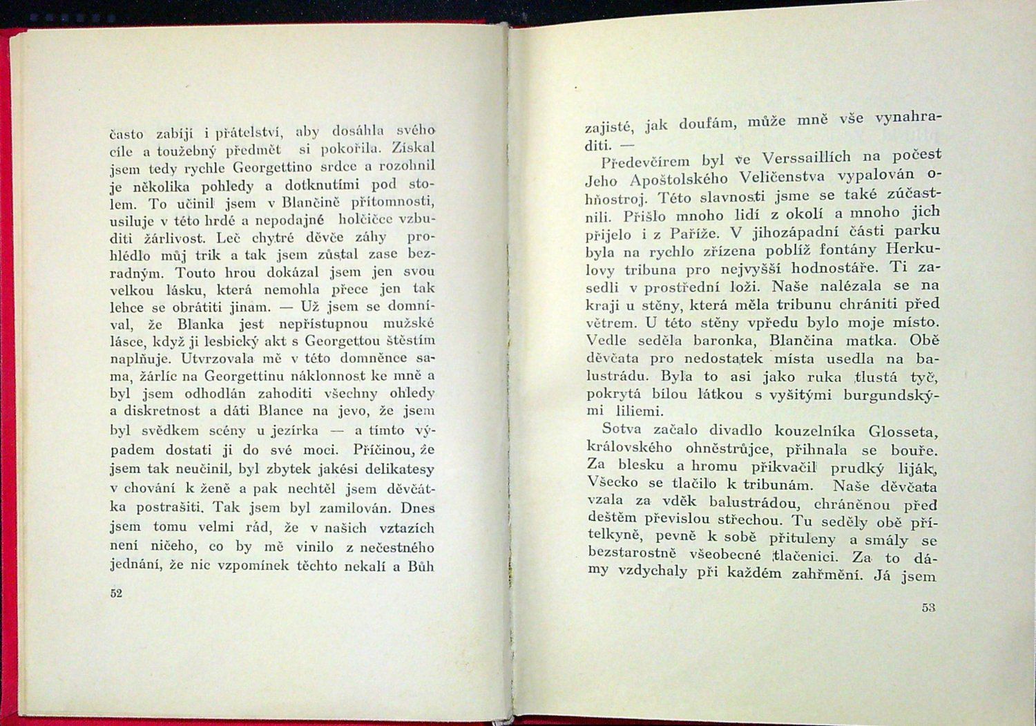 Jeden ze 100 číslovaných výtisků tištěných na dřevaprostý papír H. B., přoložil J. Snížek. V tiráži uvedeno "... je vyhrazen jen členům kroužku, nesmí býti ani veřejně prodáván, ani vyložen a půjčován, ani jinak rozšiřován (opisováním, předčítáním atd.), ani zařazen do veřejných knihoven". Pod tiráží azurka a místo pro prvního majitele, "který se jako člen kroužku čestně a vlastoručním podpisem zavázal, že vyhověl podmínkám shora uvedeným". Výtisk (jako většina) zůstal nečíslován a jméno majitele nevyplněno. - Původní vazba z červeného plátna, na předních deskách tlačený a zlacený název a drobná viněta z kosočtverců, ve hřbetu tlačený a zlacený nízev.