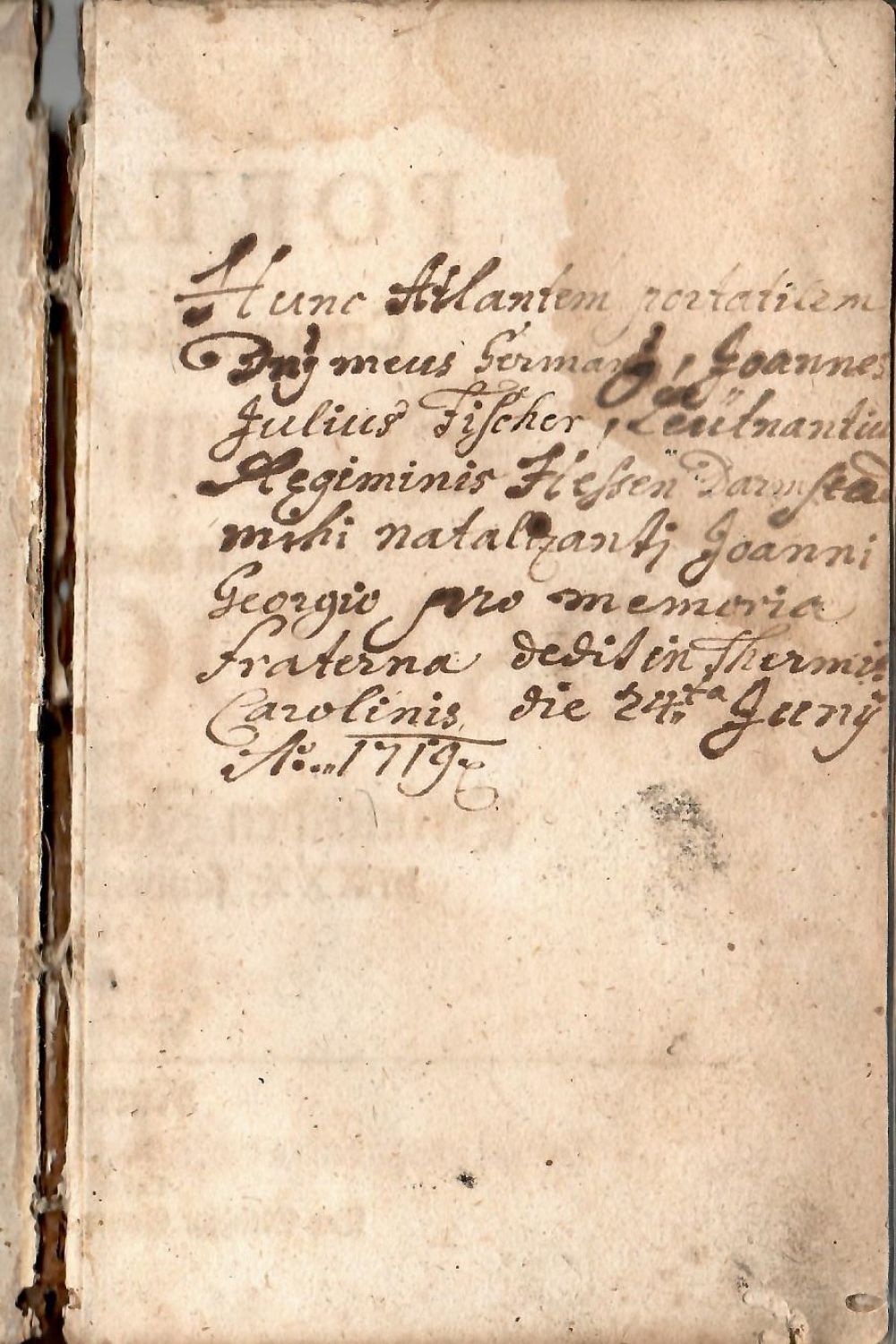 Dobová vazba z temně hnědé hověziny, ve hřbetu 3 vazy. Vazba místy odřená a zašpiněná, při horním okraji hřbetu chybí kousek koženého pokryvu a začátek pokryvu natržený, též při spodním okraji natržený. Na přední předsádce hnědým perem v 19. století napsaný seznam map s odkazem na foliaci. Na předním vakátu rkp. provenienční přípis z roku 1719 od prvního vlastníka knihy Johanna Julia Fischera poručíka pluku Hessen-Darmstadt, který knihu daroval k narozeninám svému podřízenému Joannu Georgu v Karlových Varech dne 24. června 1719. Na tit. listu při vnějších okrajích světle hnědé mapy od vlhkosti, na několika listech textu drobné hnědé skvrnky, knižní blok lehce uvolněný, Mapy ve stavu intaktním.