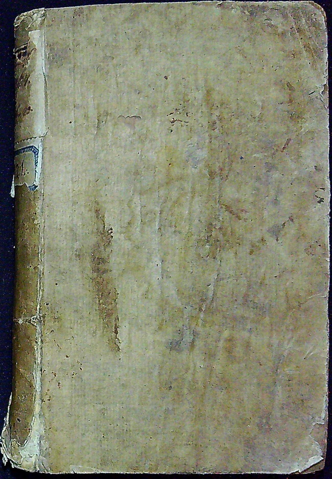 Dobová vazba s destičkami z prkének potaženými škrobovým papírem, papírový potah zvrásněný a zašpiněný, při spodním okraji hřbetu papír natržený, při horním okraji hřbetu staré papírové knihovnické štítky, naražené rohy. Na straně 64-65 dvě malé černé mapky od inkoustu.