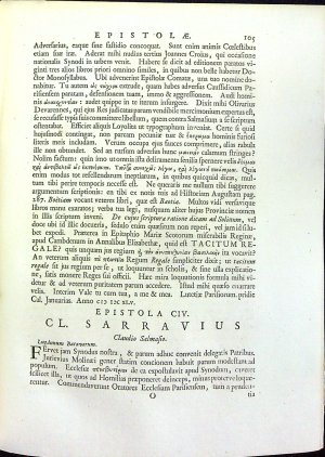 Živá záhlaví, konturové iniciály ve výši 2-3 řádků, viněty, rejstřík tištěný ve dvou sloupcích. V úvodu špatně svázané listy. Kniha obsahuje v prvé části 275 dopisů Claudia Sarravia různým významným osobnostem a jejich odpovědi, v úvodu jeho dopis švédské královně Kristýně ze sbírky M. Gudeho, ve druhé části 60 + 265 + 57 dopisů různých osobností (A. Alciati, Ph. Camerarii, H. Cardani, Erasmus, H. Grotius, J. Scaligeri, ....) ze sbírky Marquarda Gudeho.