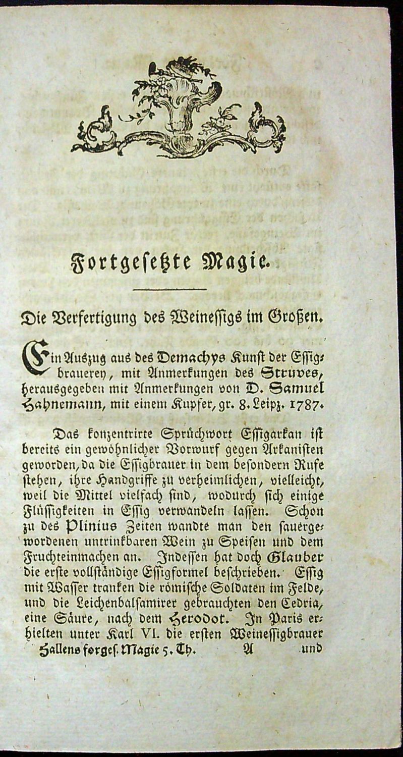 Johann Samuel Halle (11.12. 1727 Bartenstein - 9.1. 1810 Berlín), pruský historik a toxikolog. Nabízené dílo je volným pokračováním dříve publikované "Magie" a vycházelo v letech 1788 až 1802 v Berlíně (a téměř současně ve Vídni), celkem ve 12 svazcích. V jednom ze svazků autor jako prvý popsal obloukovou lampu.