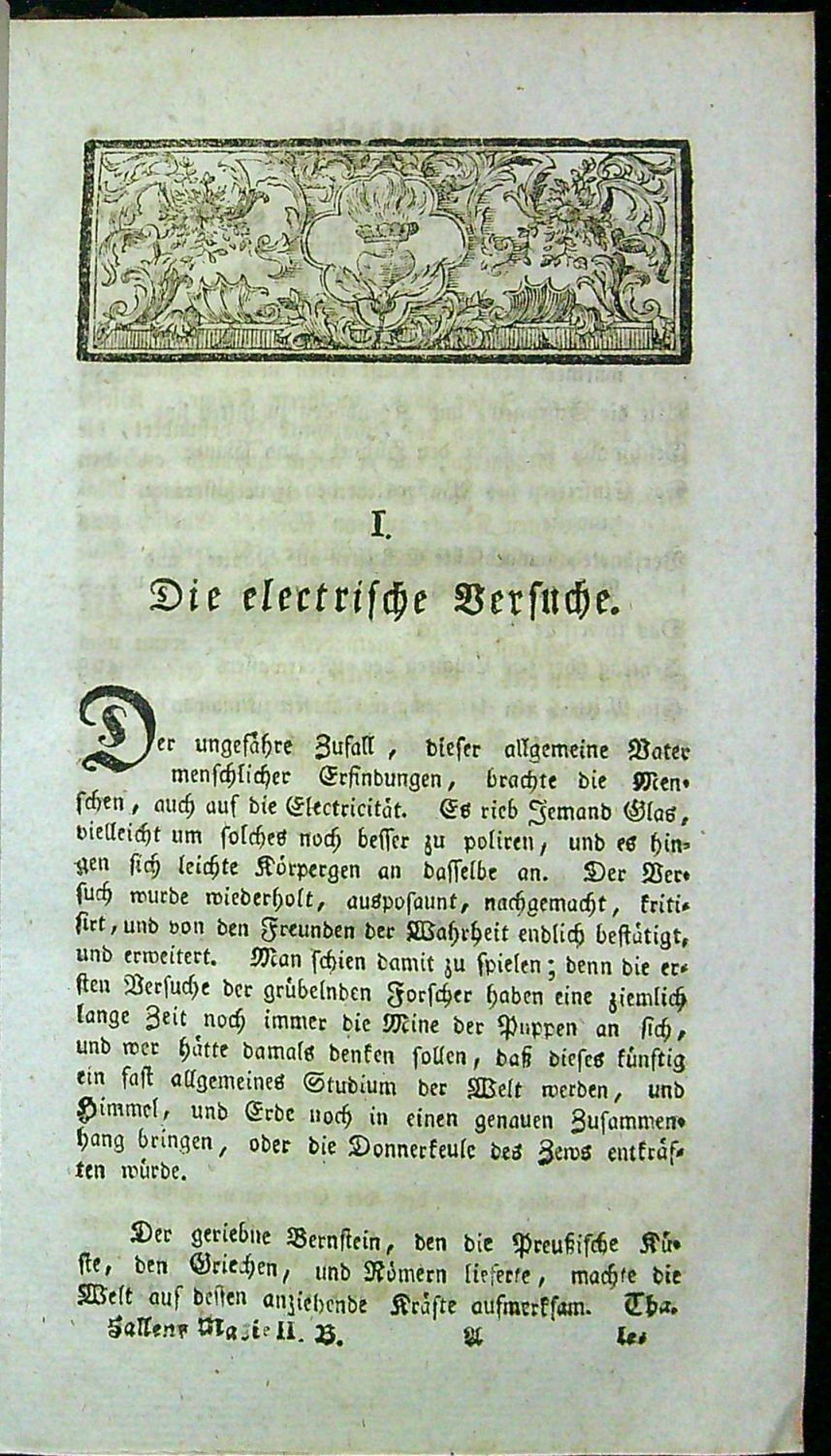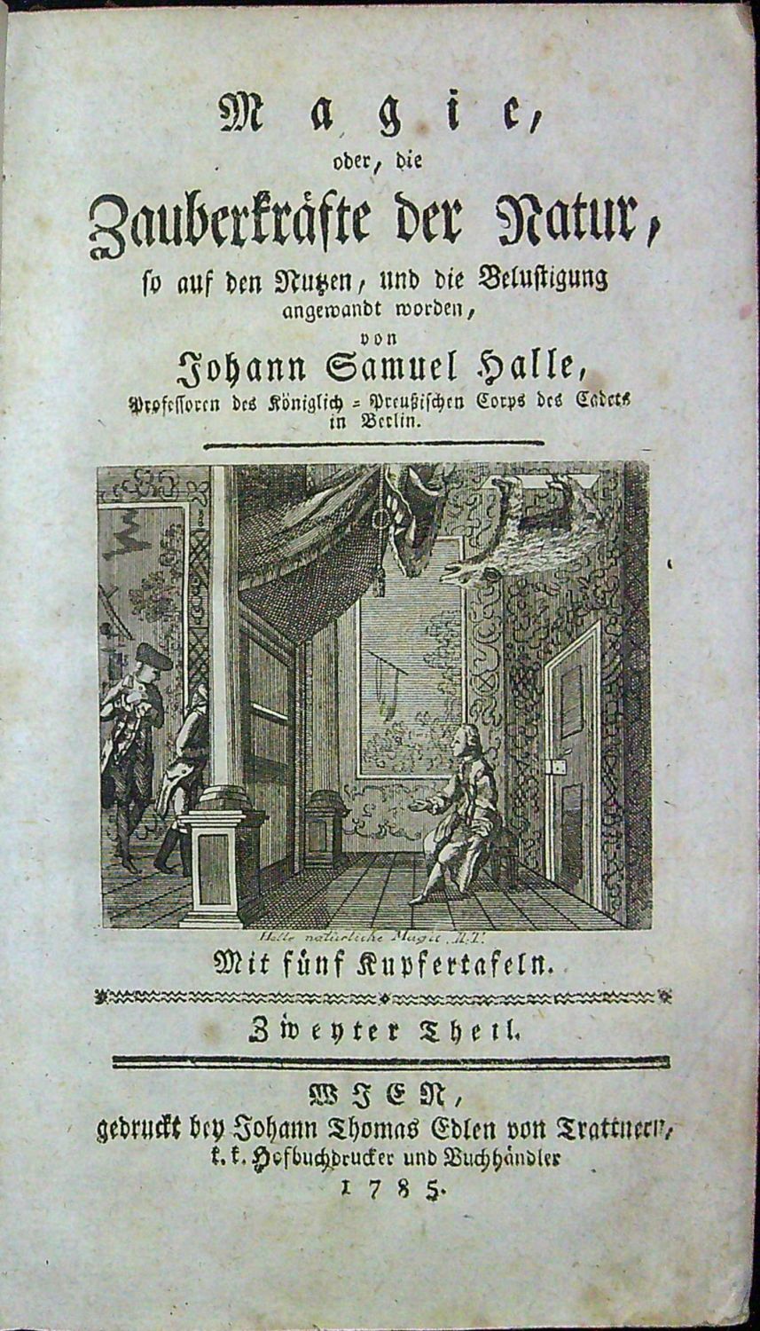 Johann Samuel Halle (11.12. 1727 Bartenstein - 9.1. 1810 Berlín), pruský historik a toxikolog. V nabízeném díle "Magie aneb kouzelné síly přírody, které přinášejí užitek a zábavu" popisuje řadu různých pokusů, mnohdy s překvapujícími výsledky. Nabízené dílo vyšlo ve čtyřech svazcích v Berlíně a téměř současně ve Vídni.