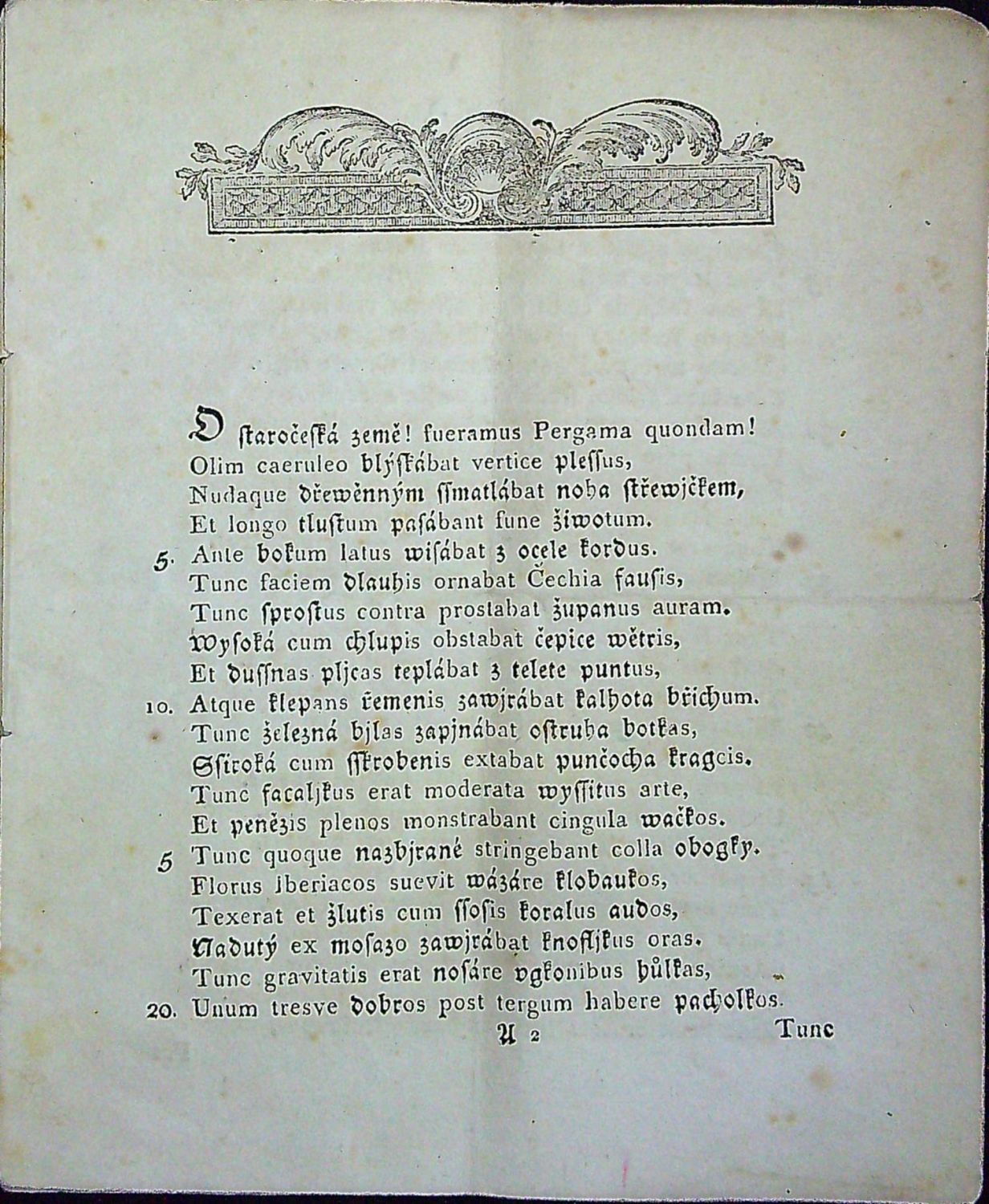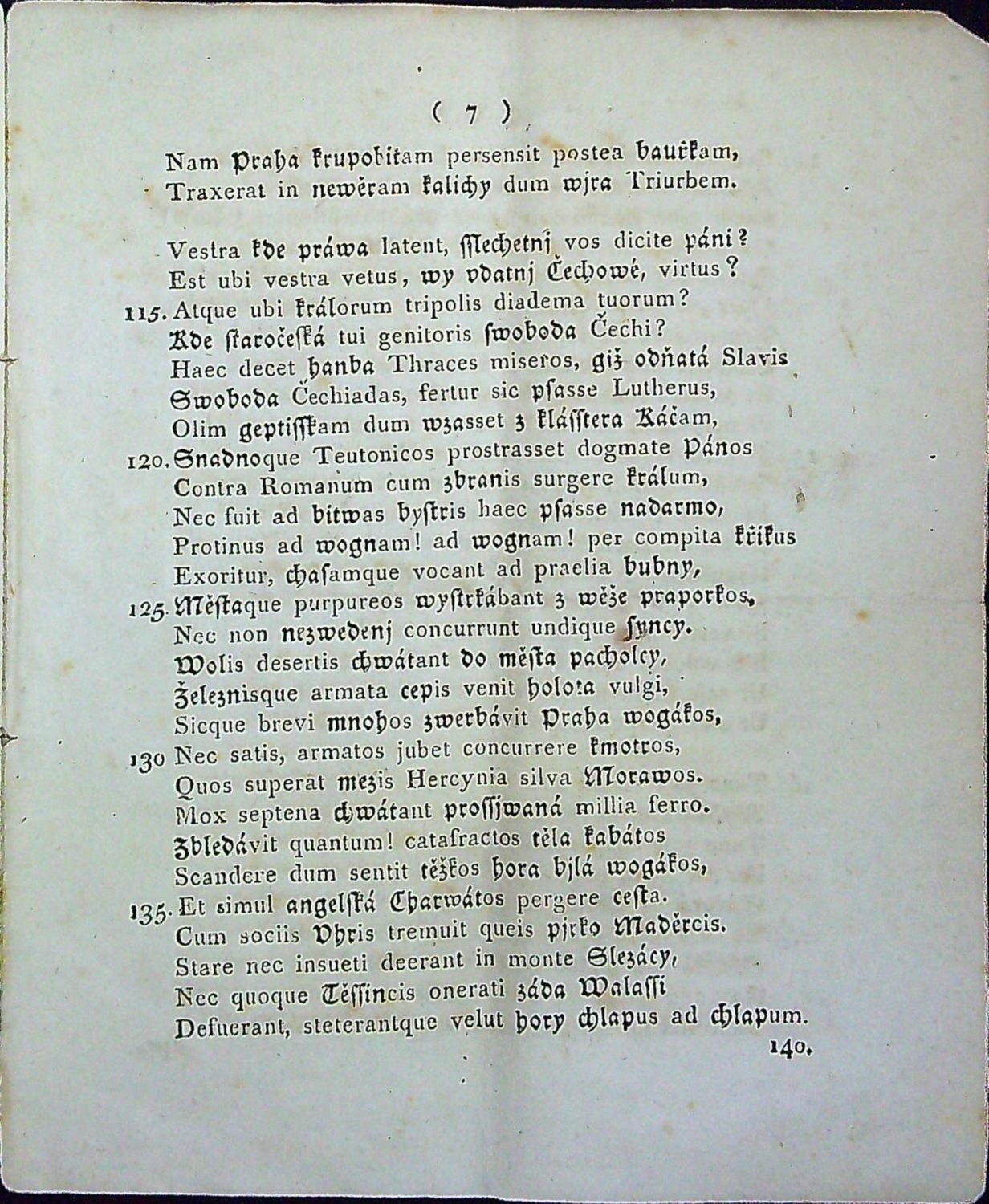 Půvabná česko-latinská básnická skladba, která stále může býti příkladem moderních českých básníků latiníků. "Calamitas s cibulí, macerata miseria s octem! Tunc wyzunkárunt staročeskam guttere wíram, Insuper et swěcenos epotavere kalichos, Et licet hos kalichos Hussitis papa vetaret, Hi tamen haerebant sitibundis semper ab hubis."