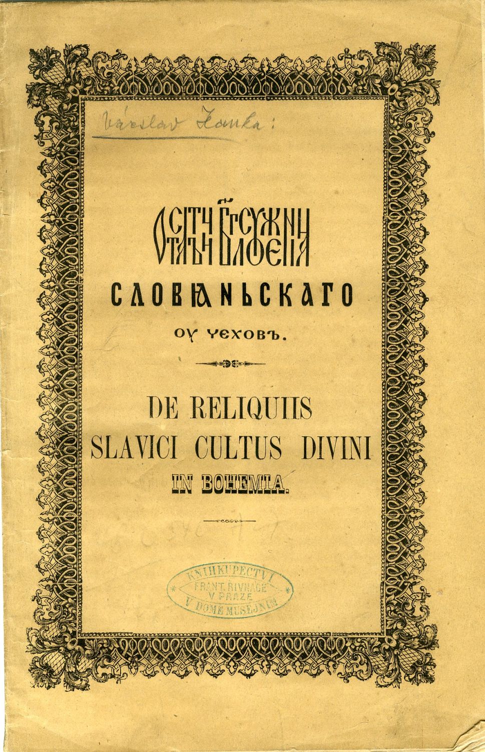 Obálka s litografovaným dekorem, na přední straně staré razítko pražského knihkupectví Fr. Řivnáče, na zadních listech hnědé skvrnky. - Variantní titul (též jako "Ostatky slovanského bohoslužení"), literárně historický úvod ve dvou sloupcích česky a rusky, církevně-slovanský text Hradeckého zlomku (Luk. XV, 20) zde chybí.