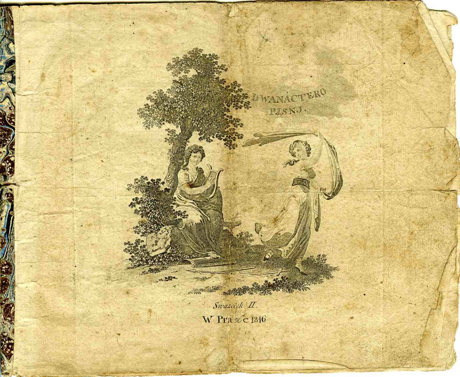 Dvoulisty, slepené původně ve hřbetu proužkem tragantového papíru, rozvolněné, pomačkané, na okrajích roztřepené, vprostřed přeložené, s hnědými skvrnkami, kus spodního okraje posledního listu odtržený bez ztáty textu. - První vydání druhého ze dvou svazků, obsahujícího kromě Hankových básní též po jedné písni od Jana Šafaříka, G. (Augusta Jiřího Pacovského?) Suchánka a Fr. Budislava Veverky. Další vydání tohoto II. sv. následovala v letech 1819, 1831, 1841 a 1851. I. sv. vydaný r. 1815 obsahoval též 12 písní, jednu z nich napsal Michal Silorad Patrčka.