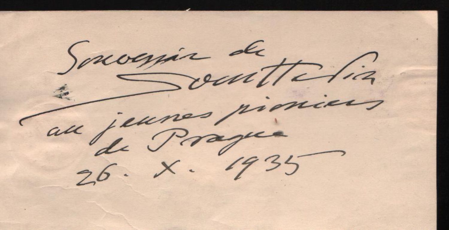 Rukopis psaný perem na rubu papíru s firemními značkami tří pražských podniků s textem: Souvenir de Sven Hedin au jeunes pioniers de Pragua 26. X. 1935."