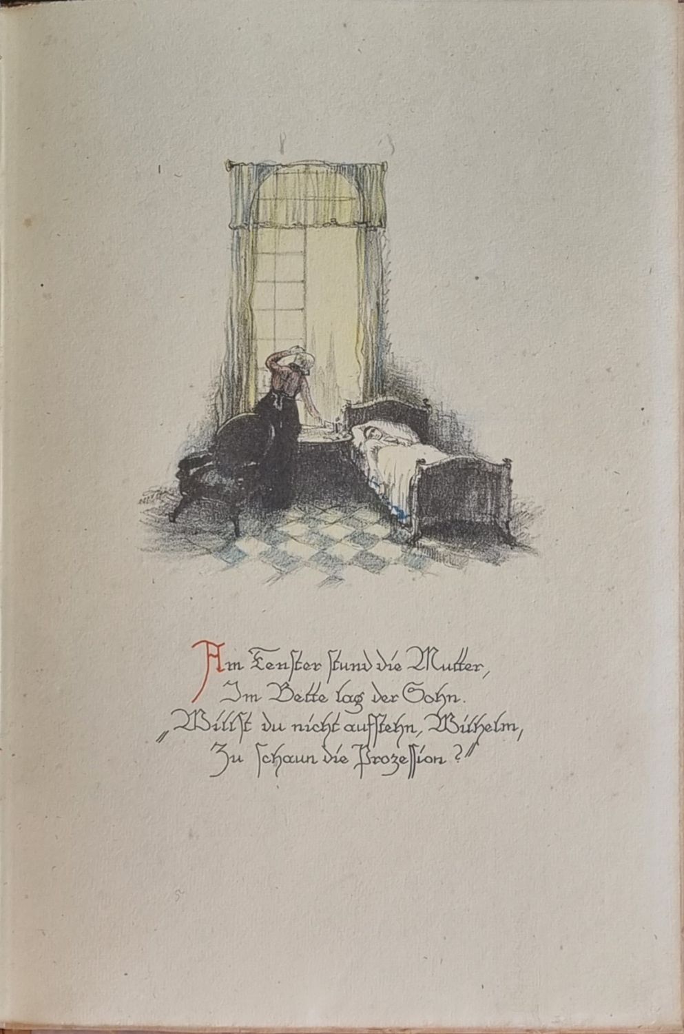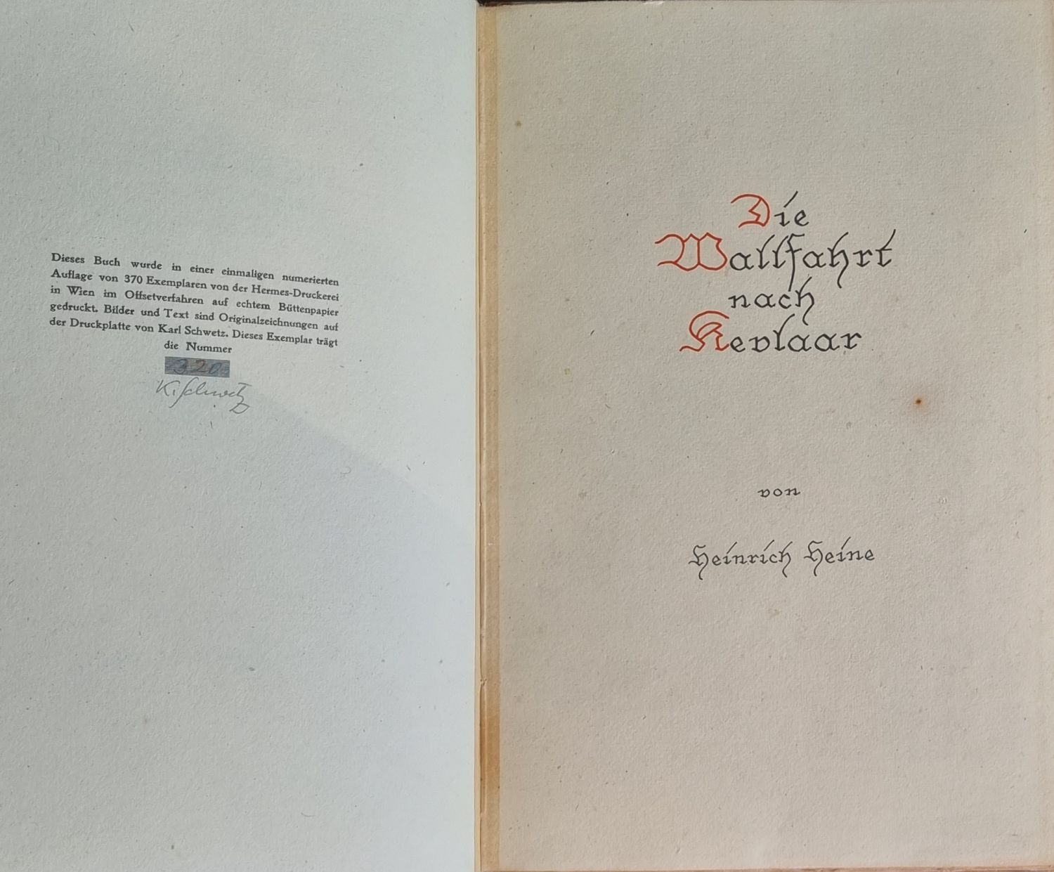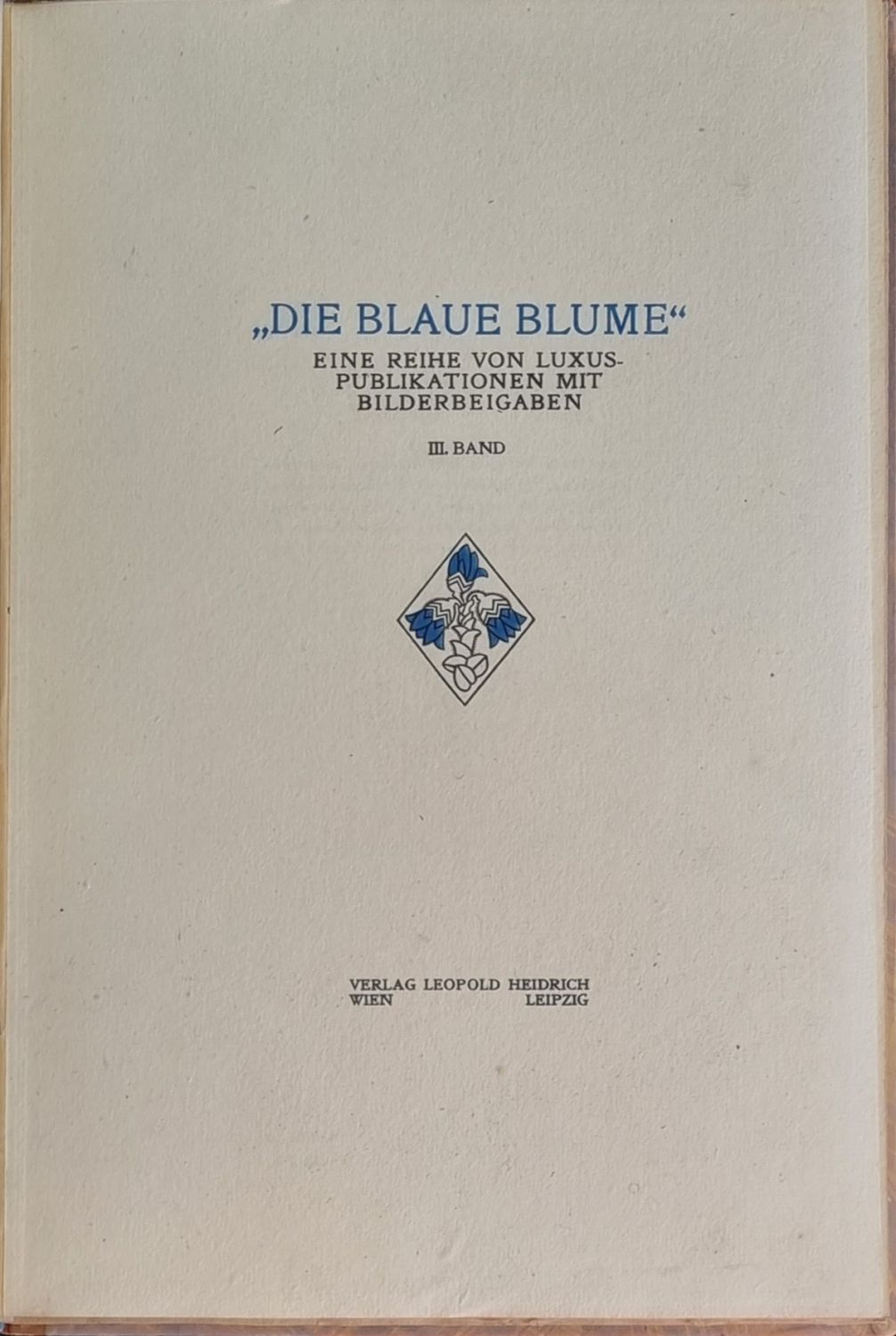 Exemplář číslo 320 z 370 vydaných a tištěných tiskárnou Hermes-Druckerei na ruční papír, dvoubarevný tisk. V textu 14 barevných litografií Karl Schwetze a značka na stránce s názvem edice. V tiráži podpis K. Schwetze tužkou. Kniha vyšla jako III. svazek luxusní edice "Die Blaue Blume".