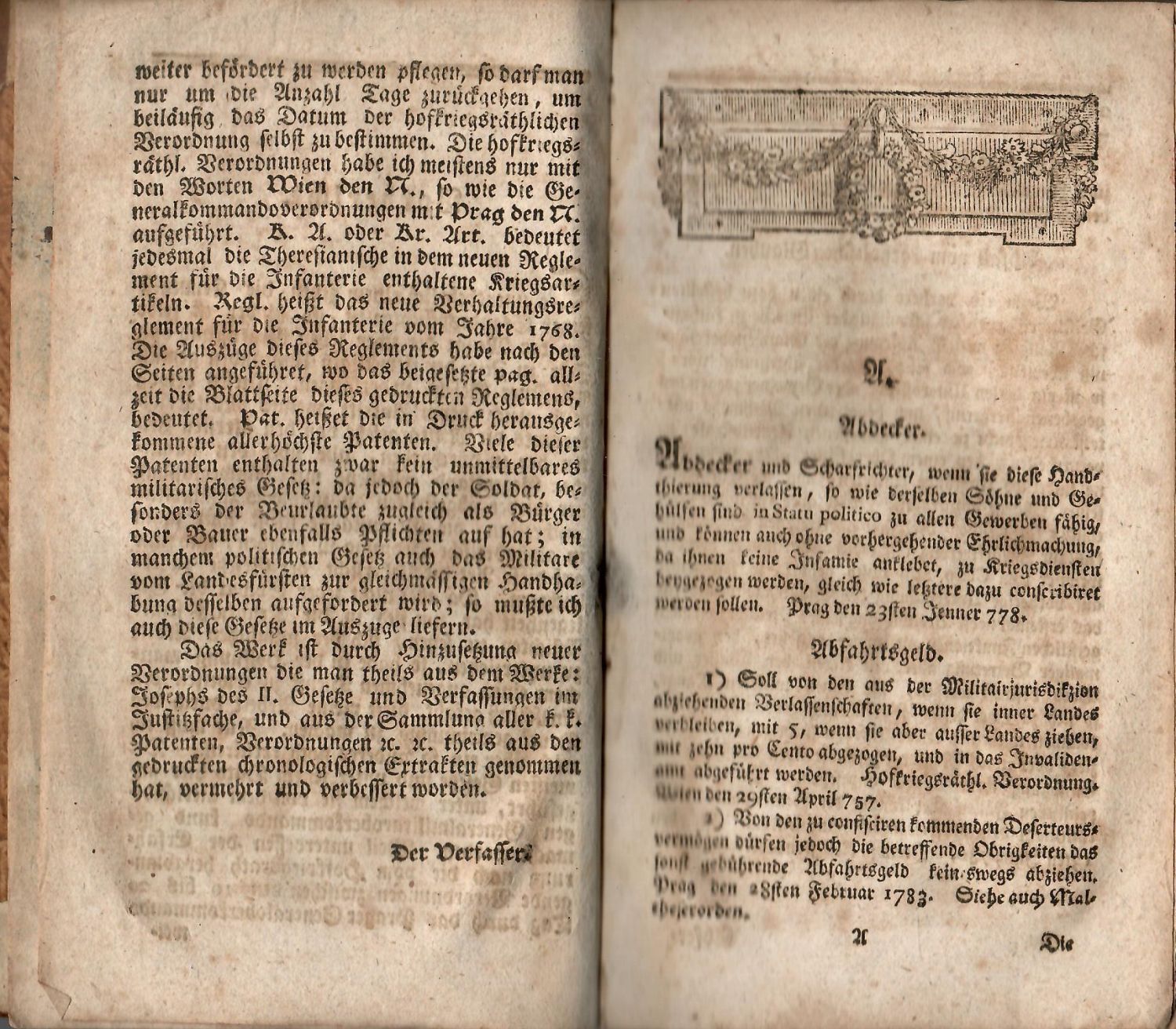 Německý text švabachem latinská slova antikvou, živá záhlaví mezi jednoduchými linkami, na tit. listu mědiryt s vyobrazením dvouhlavého orla s válečnými emblémy sign. J. Berka, v záhlaví listu A1a dřevoryt. vlys (římsa s girlandou), tučně tištěné plné iniciály.