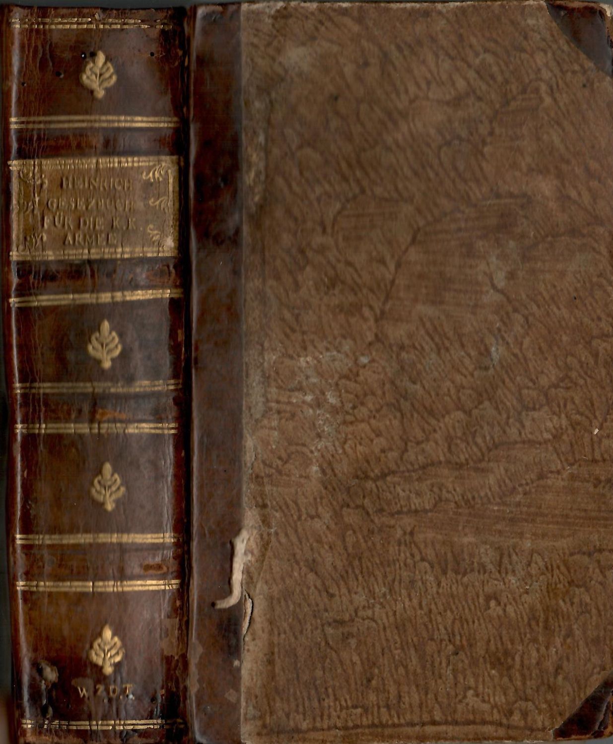 Dobová vazba s kartonovými deskami potaženými mramorovaným papírem, kožený hřbet a nárožnice, ve hřbetu 4 vazy, jednotlivá pole olemovaná dvojitou zlacenou linkou, ve druhém poli světle hnědý dobový kožený štítek s tlačeným a zlaceným názvem, v ostatních polích tlačený a zlacený rostlinný ornament, při spodním okraji hřbetu tlačené a zlacené iniciály prvního vlastníka knihy a objednatele vazby "W.Z.D.T." (Wencel Zischka de Trotznov), stříkané ořízky. Vazba ohmataná, místy odřená, na přední desce v koženém pokryvu u hřbetu proděravělá, při horním i spodním okraji hřbetu drobné dírky od červotoče, naražené rohy. Na předním přídeští zbytky červené pečetě a při spodním okraji perem vlastnický přípis "Wencel Zischka de Trotz.", na tit. listu stará začerněná razítka, která jsou též na straně poslední, na straně 36 nezačerněné razítko "I. Infant. Regiment Bibliothek ?". Papír místy zahnědlý.