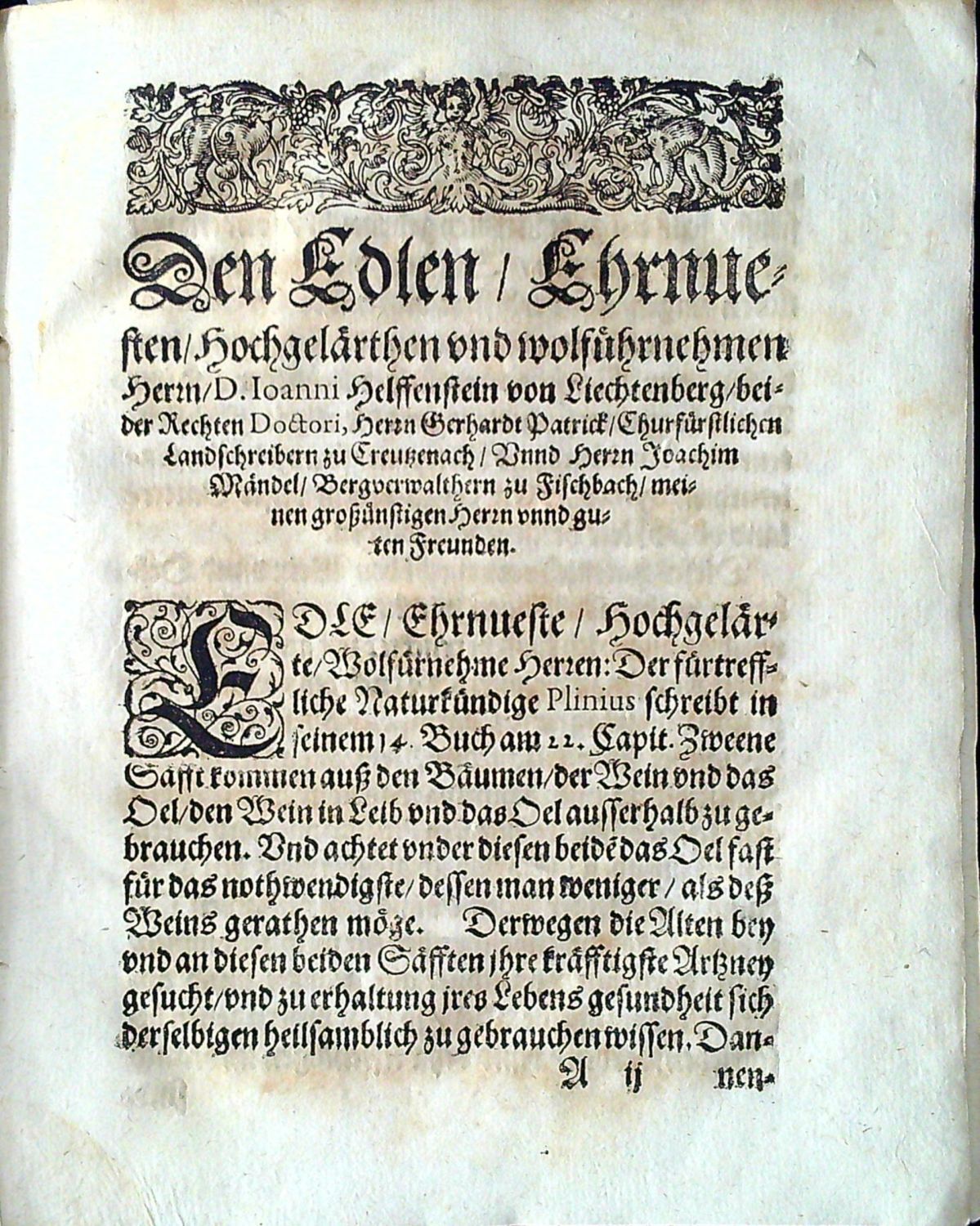 9 Bl., 165-11 S. Mit Holzschnitt-Vignete auf dem Titel, Kopf - und Schlussvignette und 1 Abb. im Text. Späterer marmorierter Pappband (berieben, Ecken bestossen, Rücken mit Bezugsfehlstellen). 3 Löcher auf dem rot/schwarz gedruckten Titel, 1 auf dem fünften nn. Bl. und 1 auf d. S. 157/8, alle mit etwas Buchstabenverlust. Die grössten 2 Löcher in etwa Grösse 2 x 2 cm auf dem Titel und auf d. S. 157/8 hinterlegt. Einige Bl. stark gebräunt. Als vorderer Vorsatz wurde lateinische Handschrift auf Papier verwendet.