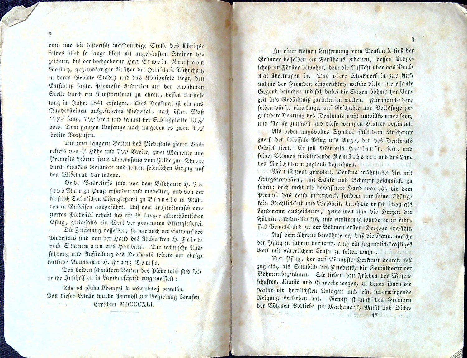 Přemysl´s Denkmal auf dem Königsfelde bei Staditz, errichtet von dem Hochgebornen Herrn Erwein Grafen von Nostitz-Rienek. Mit Hinsicht auf vaterländische Sagen beschrieben von ....