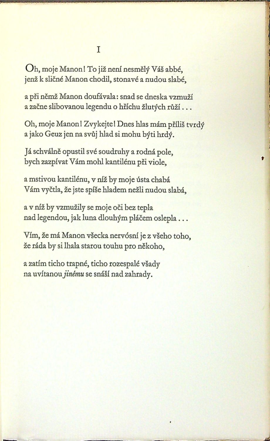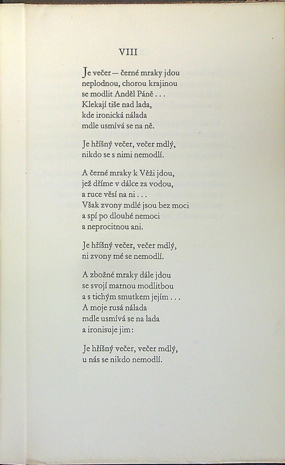 Ručně čísl. ex. 93 ze 100 vydaných. Úvodním slovem opatřil Jiří Karásek ze Lvovic, upravil Method Kaláb a vytiskla Průmyslová tiskárna v Praze. - Kartonová obálka potažená modrým škrobovým papírem s chlopněmi, na přední straně obálky žlutý pap. štítek s věcným názvem (původní adjustace). Obálka ve hřbetu a při okrajích vyšisovaná od světla. Knižní blok neoříznutý a nerozřezaný.