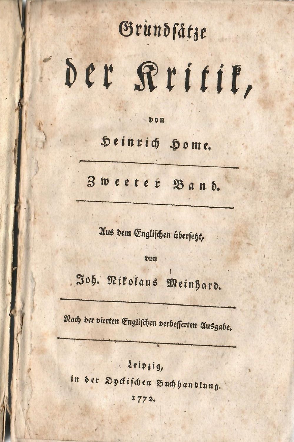 Dobová kartonová vazba potažená světle modrým papírem, barvené ořízky. Vazba zašpiněná, pap. pokryv místy potrhaný, u prvního svazku ve hřbetu z větší části chybí. Papír místy zahnědlý, tu a tam drobné hnědé skvrny, tit. list 2. svazku uvolněný z knižního bloku. - Z anglického 4. vydání do němčiny přeložil Johann Nikolas Meinhard.