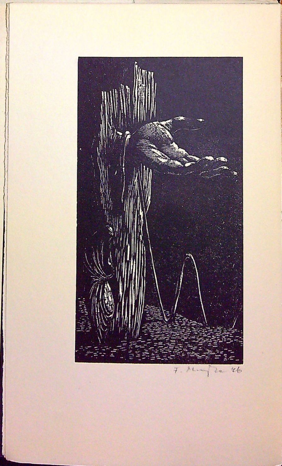 Vydáno k básníkovým nedožitým 60. narozeninám s doslovem A. M. Píši a vydavatelskou poznámkou Karla Janského, písmem Fournier na holandském ručním papíru vytiskl Orbis, černý a modrý tisk. - Ex. č. 274/300. Horní okraje obálky mírně pomačkané, její zadní strana mírně ušpiněná, jinak dobrý stav.