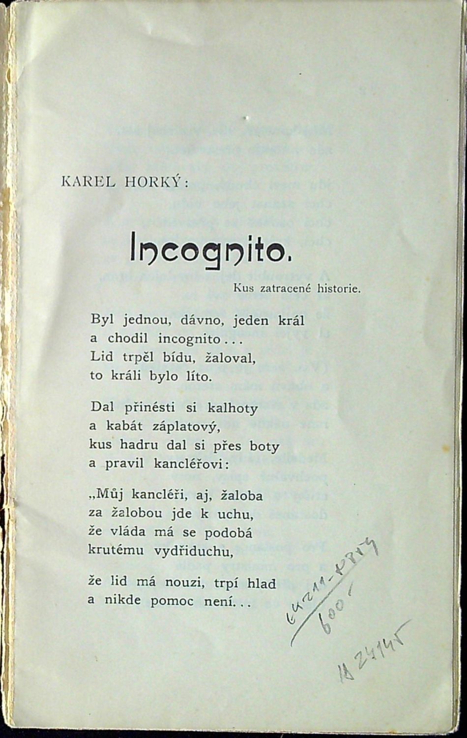 Na přední straně obálky ze štočku tištěná ilustrace Gellnerova, vytiskla tiskárna a chromotypie Jos. B. Zápotočného v Rokycanech. - Přední strana obálky ve spodní polovině oddělená od hřbetu.