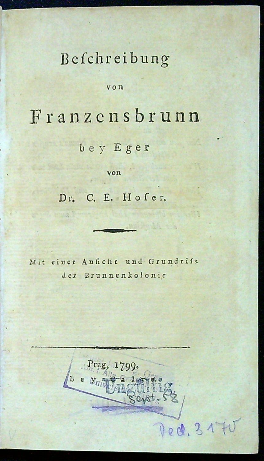 Tištěno antikvou, ve front. lept (126 x 80 mm) s pohledem na Františkovy Lázně a rytým nápisem "Ansicht des K. Franzensbades aus dem Hohlwege bey Schlada". Na konci knihy vyklápěcí plán, lept (130 x 310 mm) se schematickým vyobrazením léčebných pramenů a rytým nápisem "Situationsplan von der Anlage des Kaiserfranzensbades", sign.: "Jo. Berka sc.". Mezi stranou 42-43 rozkládací tabule.