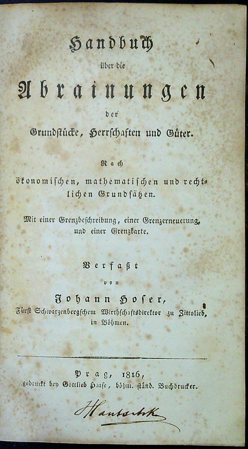 Handbuch über die Abrainungen der Grundstücke, Herrschaften und Güter. Nach ökonomischen, mathematischen und rechtlichen Grundsätzen. Mit einer Grenzbeschreibung, einer Grenzerneuerung und einer Grenzkarte.