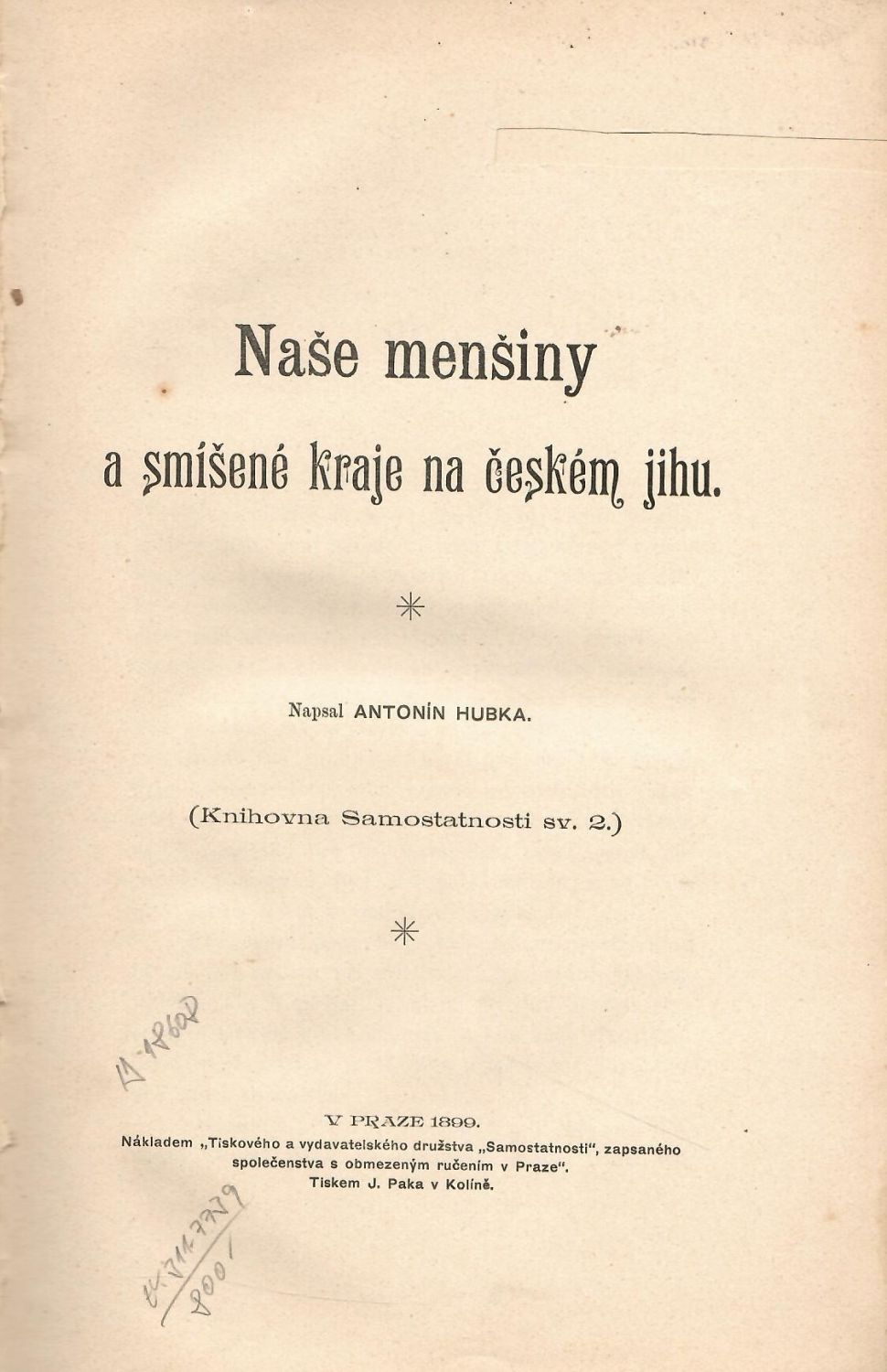 přívazek: Hubka Antonín "Čechové v Dolních Rakousích". Studie z cest. Praha, 1901, Samostatnost, 77-VI str.