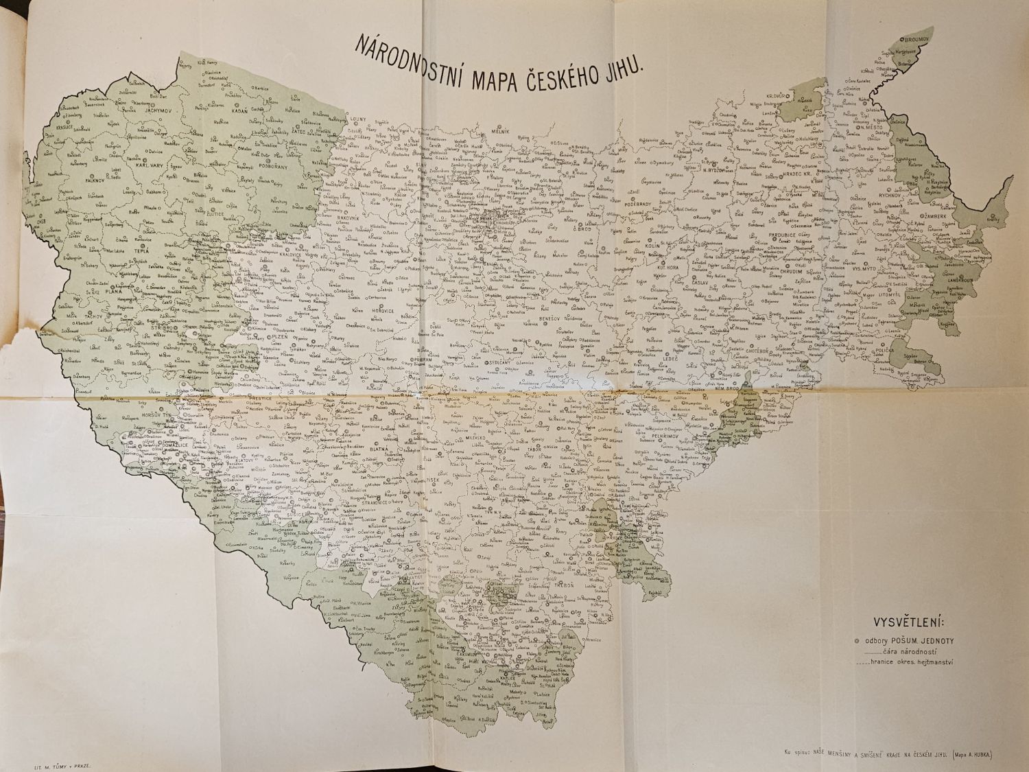 V textu dvě rozkládací mapy, prvá zobrazující česká jazyková území a území jejich sousedů, druhá s národnostním vyobrazením na českém jihu, obě mapy lehce natržené.