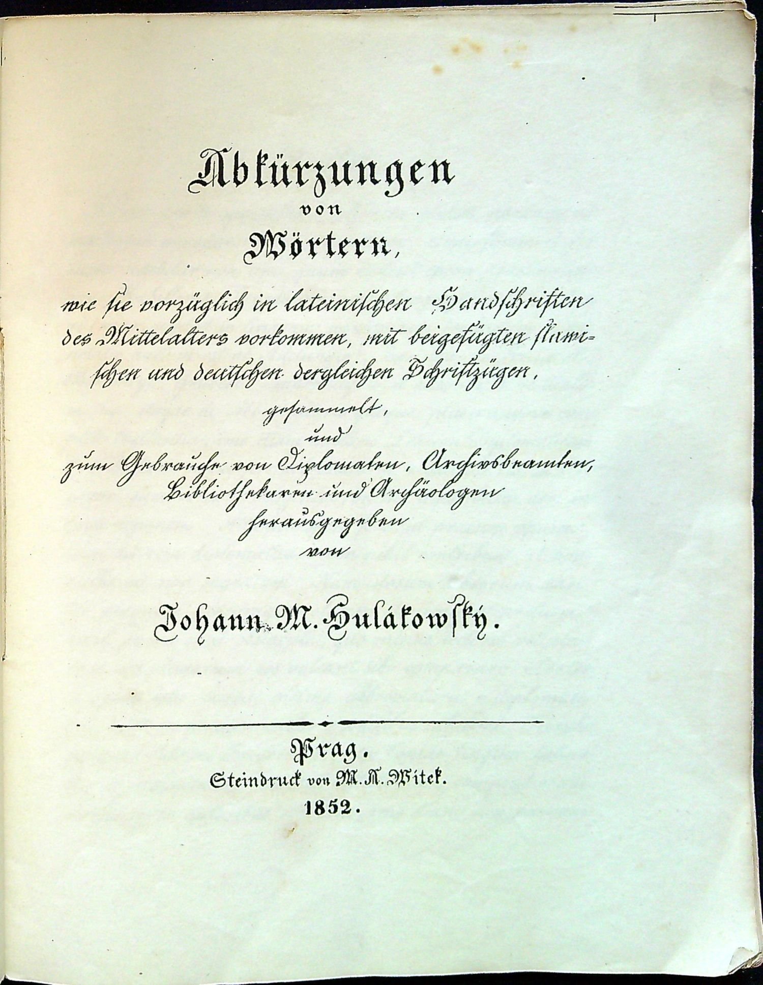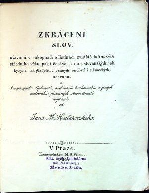 Abbreviaturae vocabulorum. Zkrácení slov, užívaná v rukopisích a listinách zvláště latinských středního věku, pak i českých a staroslovanských, jak kyrylicí tak glagolitou psaných, anobrž i německých, sebraná, a ku prospěchu diplomatů, archivarů, knihovníků a jiných milovníků písemných starožitností vydaná od Jana M. Hulákovského.
