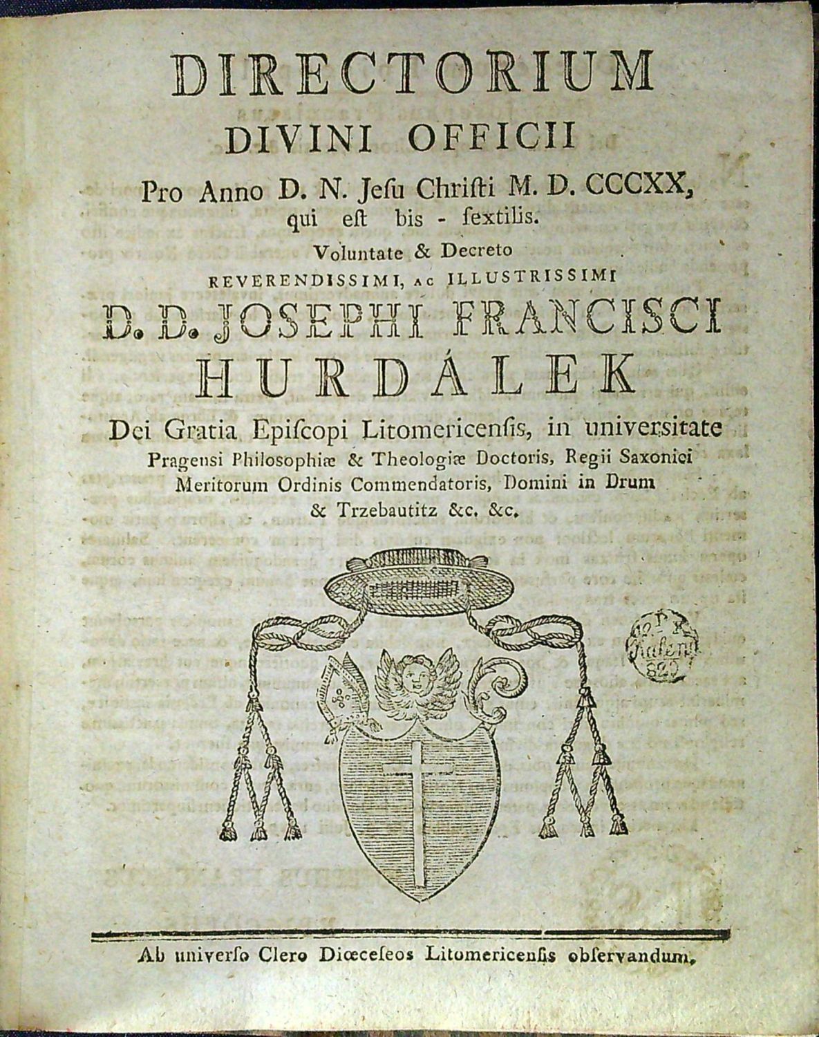 DIRECTORIUM DIVINI OFFICII Pro Anno D. N. Jesu Christib M.D. CCCXX, qui est bis - sextilis. Voluntate & Decreto reverendissimi, ac illustrissimi D. D. JOSEPHI FRANCISCI HURDALEK Dei Gratia Episcopi Litomericensis, in universitate Pragensi Philosophiae & Theologiae Doctoris, Regii Saxonici Meritorum Ordinis Commendatoris, Domini in Drum & Trzebautity &c, &c.