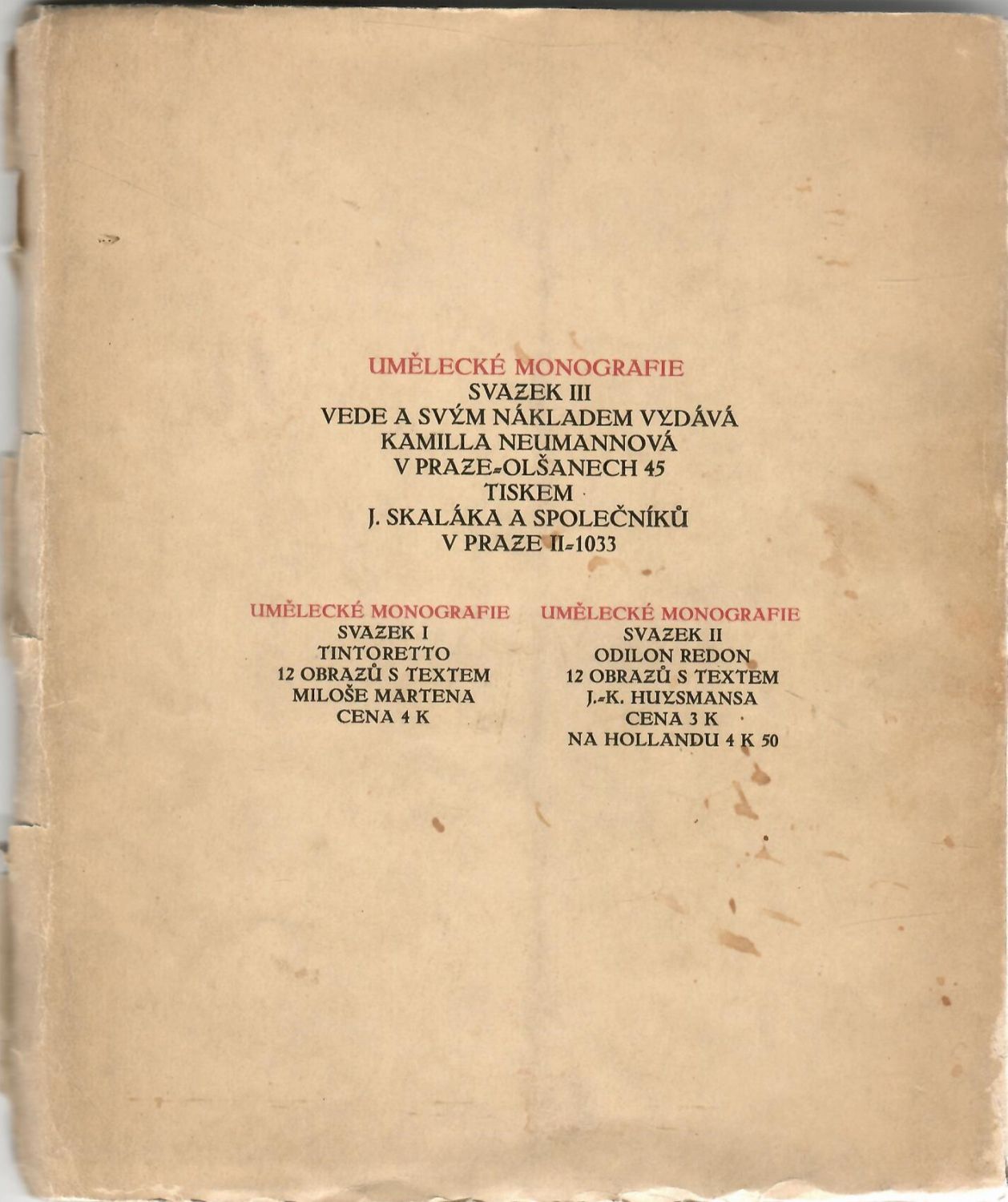 Červeno-černě tištěná přední strana obálky a tit. list. - Původní obálka, při vnějším okraji pomačkaná a ve spodní části hřbetu odřený papír, na přední straně obálky při spodním vnitřním okraji světle hnědá skvrna, knižní blok neoříznutý.
