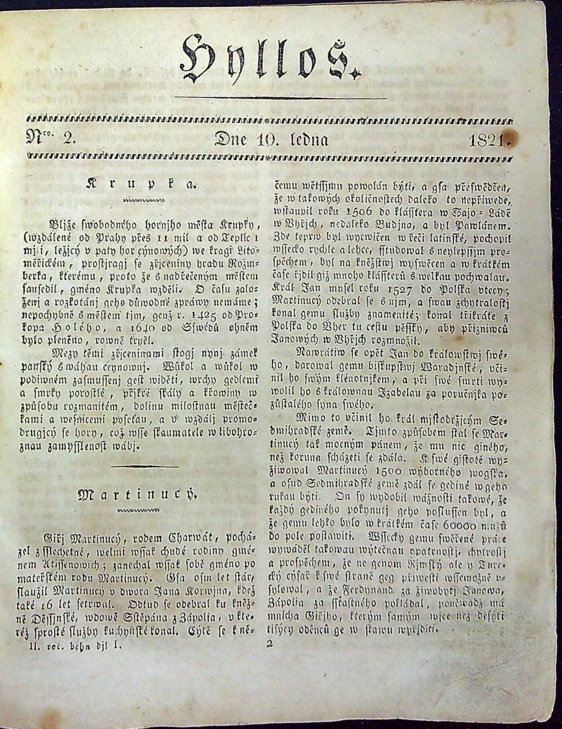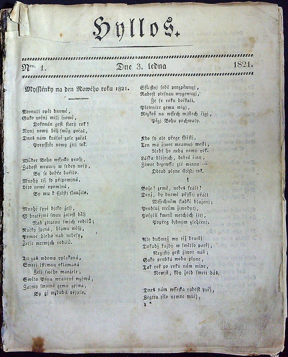Hyllos. Národnj časopis poučugjcýho a obweselugjcýho obsahu. ... Wydáwaný od K. C. Rainolda, wedený od Jana Hýbla. 1821. Prwnj půlletj. č. 1-26 (kompletní ročník)