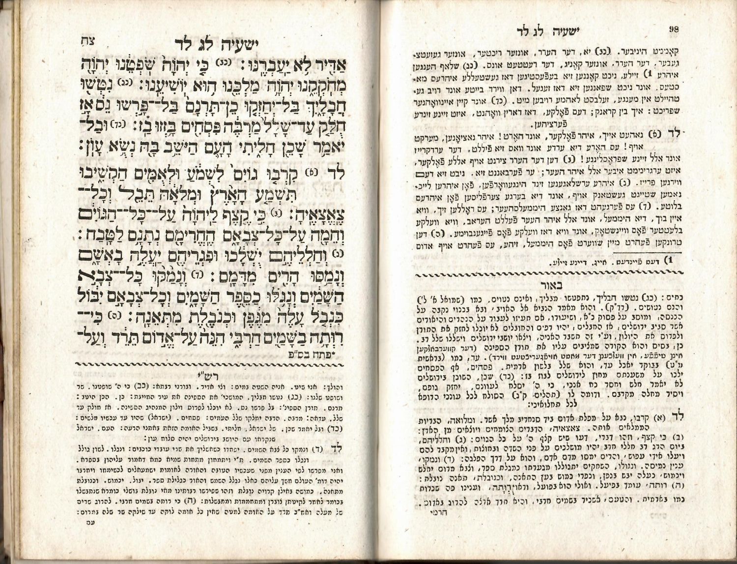 Tisk v hebrejštině (obsahuje též německý překlad tištěný hebrejskými písmeny), latinkou tištěné impresum a několik poznámek pod čarou. Rašiho komentáře oddělené jednoduchými linkami či vlnovkami. - Dobová kožená vazba , odřená a ohmataná, ve hřbetu dva kožené štítky s názvem a vyznačením dílu, v ostatních polích tlačené a zlacené rostlinné ornamenty. - Kniha obsahuje "Knihu Izajášovu" a je IV. dílem ve Vídni vydaného Písma svatého v hebrejštině.