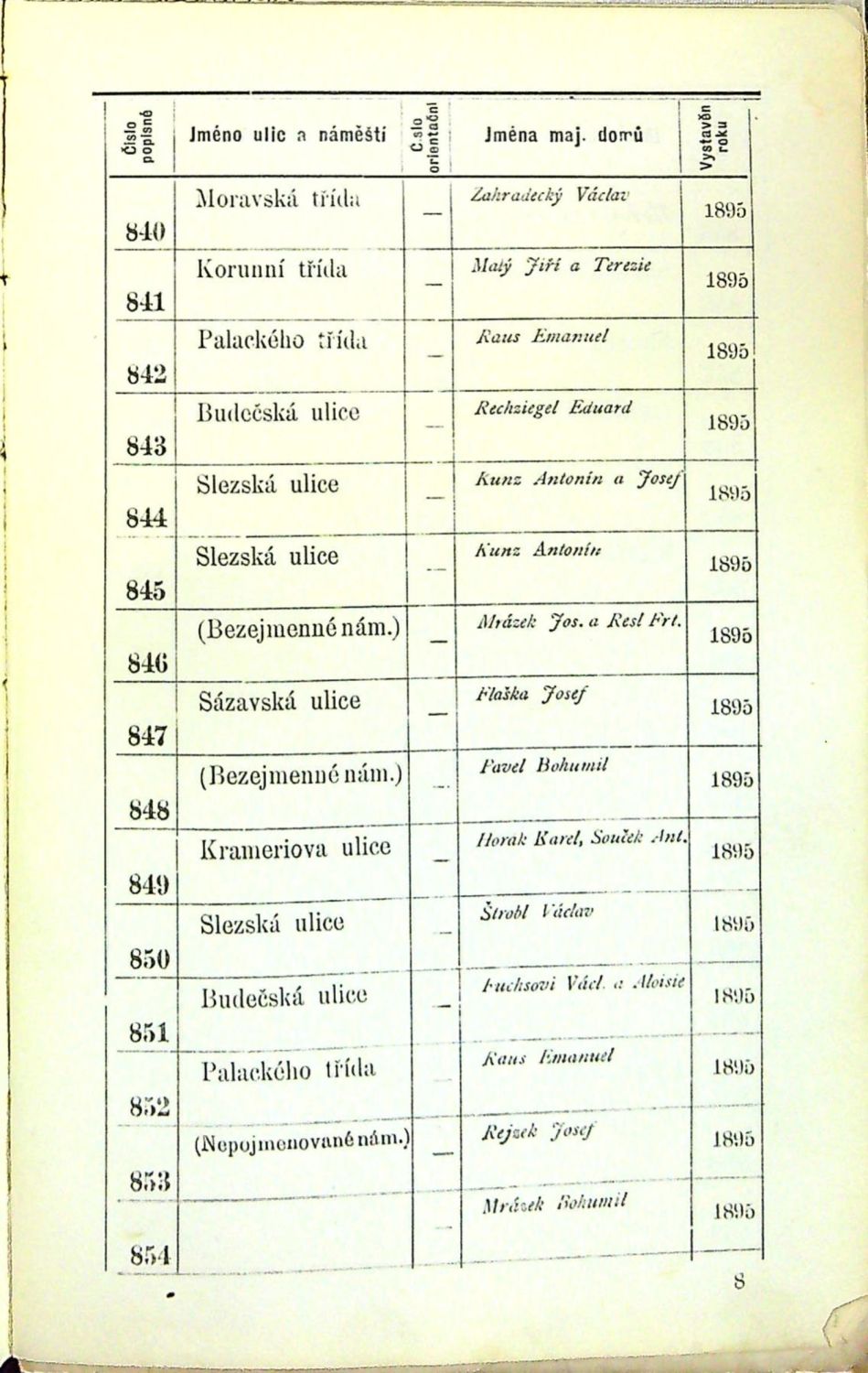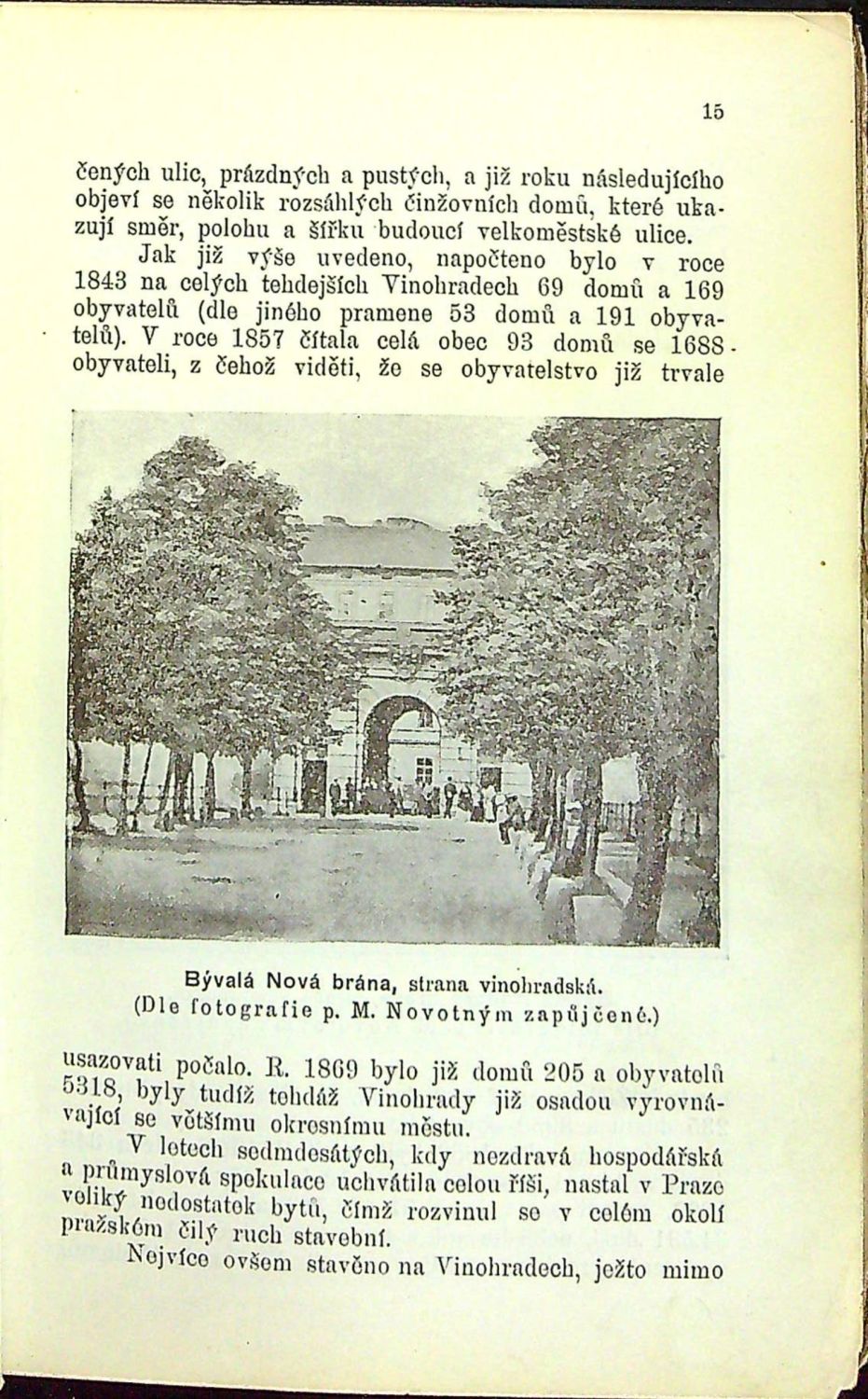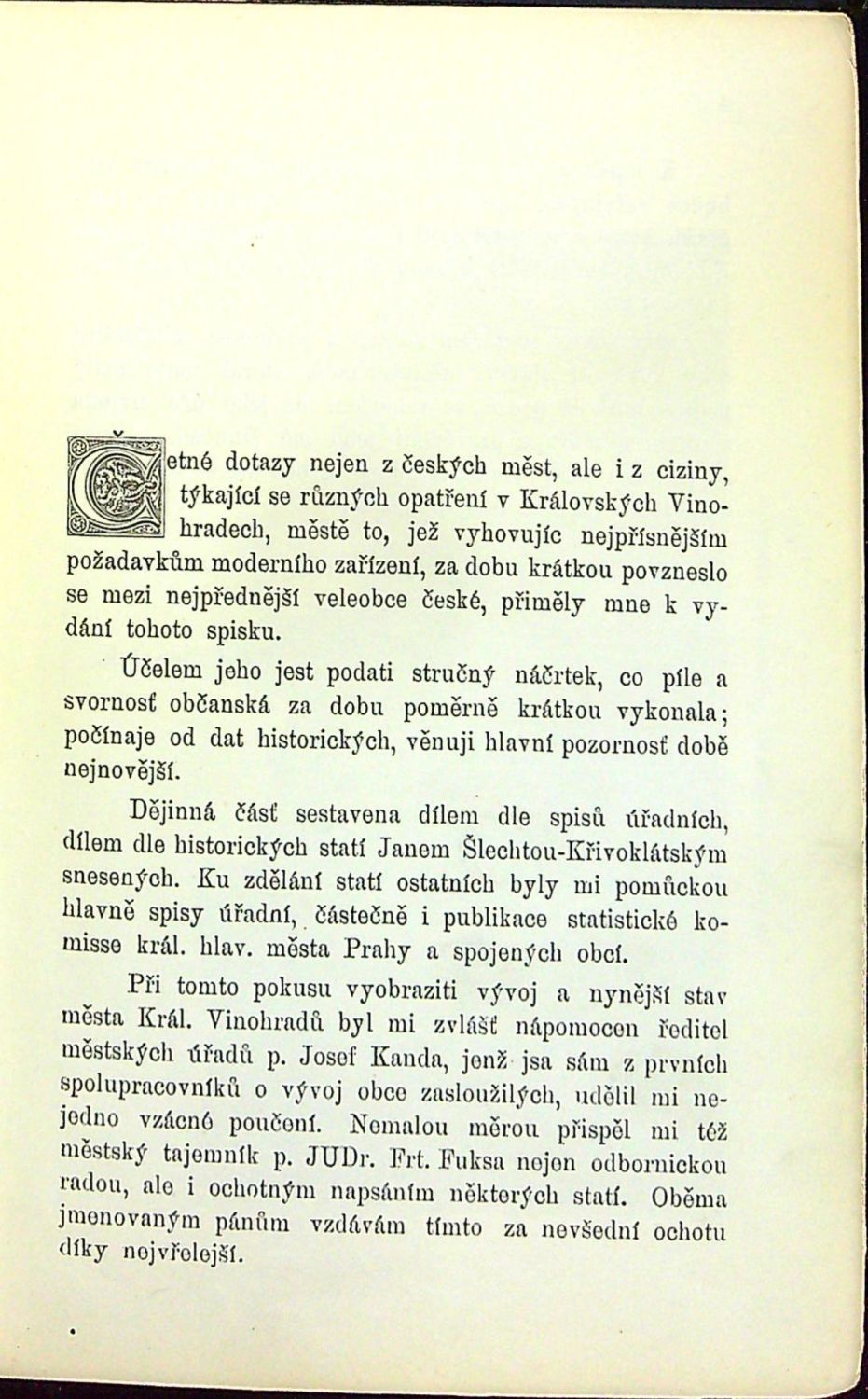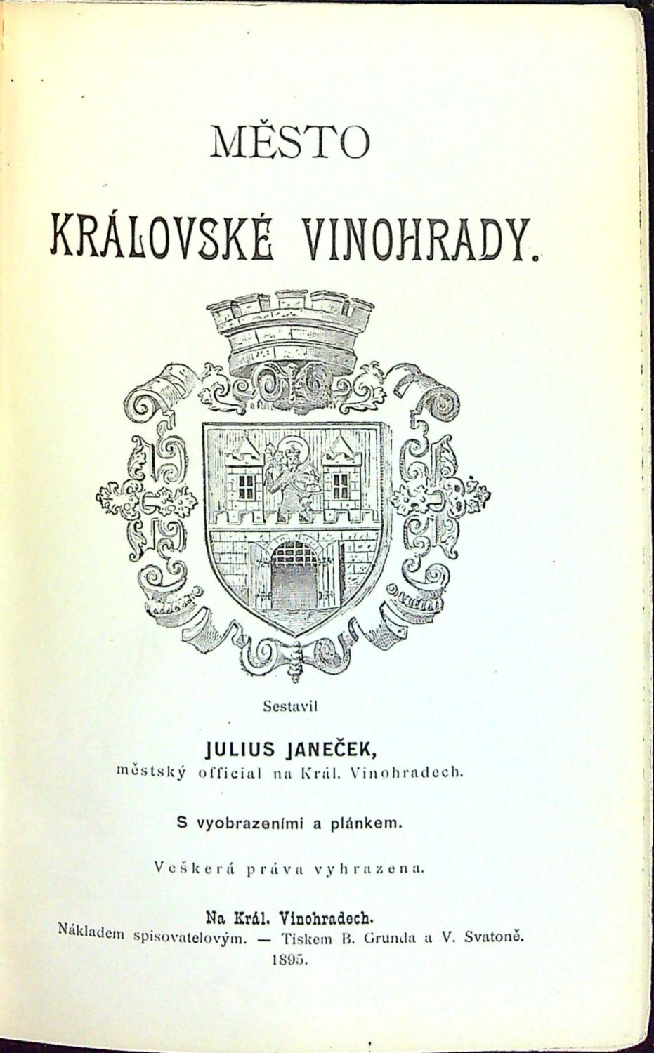 Na tit. listu znak Král. Vinohrad, konturové iniciály na ornamentálním pozadí zalomené do výše 3-4 řádků, v textu fotograf. vyobrazení různých vinohradských pamětihodností, za paginovanou částí mezititul "Seznam domů a ulic města Král. Vinohradů" a na dalších 36 nepag. listech seznam celkem 860 domů s uvedením jejich majitele. Na konci rozkládací plán města Král. Vinohrad. Mezi str. 56-57 rozkl. příloha se sazbou hřbitovních poplatků.