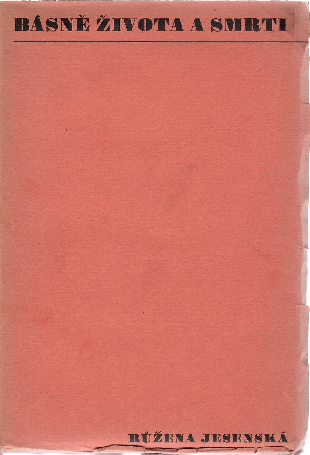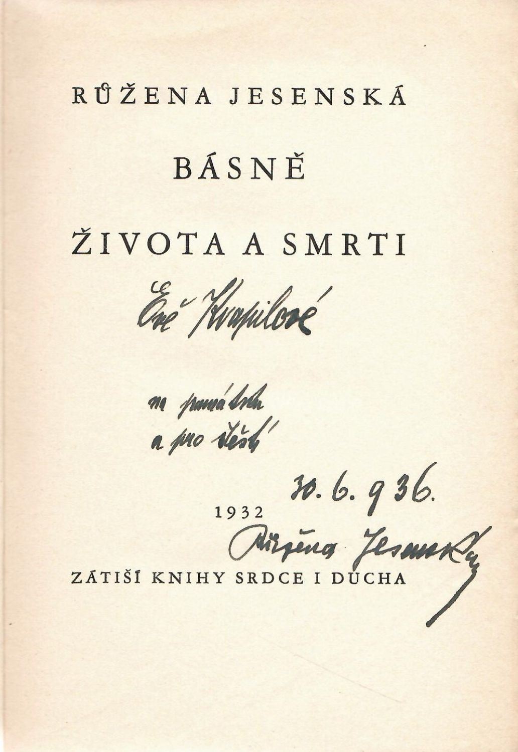 Na titulním listu rukopisná dedikace "Evě Kvapilové na památku a pro stěstí 30. 6. 936 Růžena Jesenská". Papírové desky při okrajích pomačkané, hřbet lehce vybledlý.