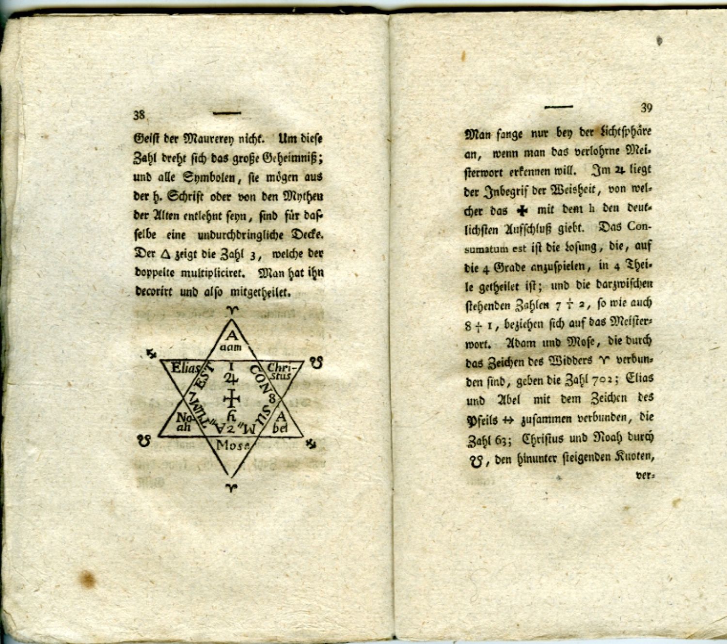 - Dobová nezdobená šedomodrá obálka, přes horní okraj hřbetu přelepen papírový štítek, při spodním okraji rubu přední strany obálky štítek s iniciálami některé ze zednářských lóží (AP). - Papír místy zahnědlý, oslí uši.