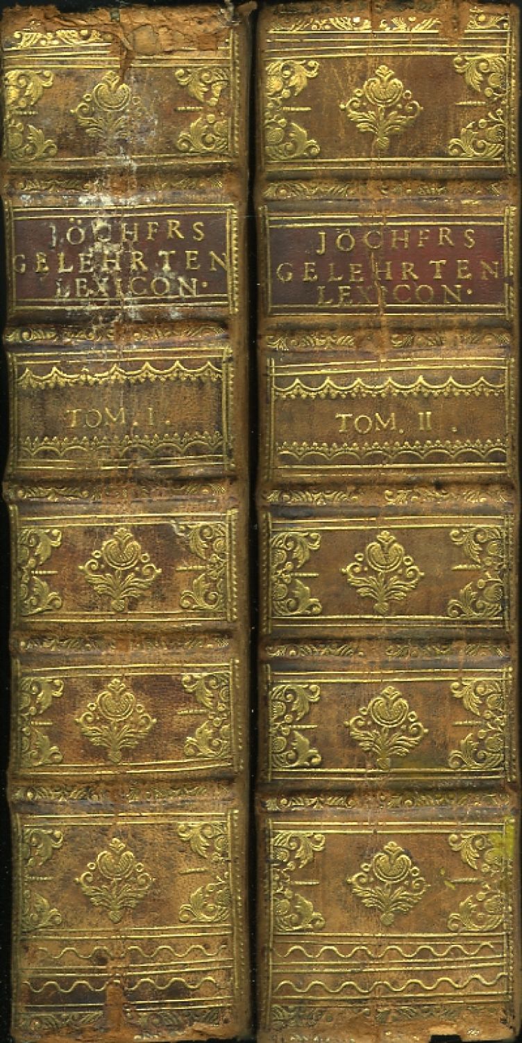 Christian Gottlieb Jöcher (20.7.1694 - 10.5.1758 Lipsko), německý učenec, knihovník a lexikograf, od roku 1730 řádný profesor na filosofické fakultě na universitě v Lipsku. Nabízený slovník vyšel poprvé roku 1715 a podruhé roku 1725 a jeho autorem byl lipský profesor Johann Burckhradt Mencke (1674-1733). Jöcher toto třetí vydání opatřil předmluvou a práci rozšířil a doplnil.