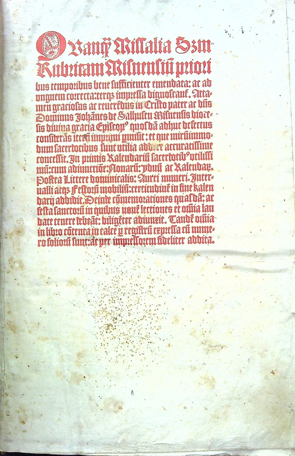 Missale Misnense. - QVanq[uam] Missalia S[ecundu]m Rubricam Misnensiu[m] prioribus temporibus bene sufficienter emendata: ac ad anguem correcta terg[ue] impressa dignoscant[ur]. Atta=men graciosus at reuer[m]edus in Christo pater ac d[omi]n[u]s Dominus Johanes de Salhusen Misnensis diocesis diuina gracia Episcop[us] .......
