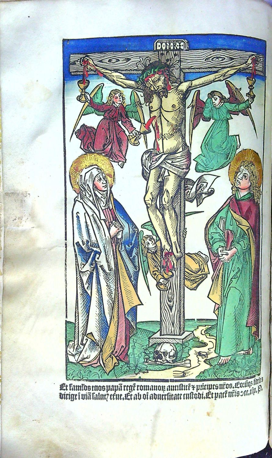 Foliace: X, A-N8, O10, A8, B6, C8, ▩4, VIII (na pergamenu), P-Q10, R-S8, T-V10, X-Z8, a-i8, k-10, l-7. Tištěno texturou, červeně tištěný titulní list, červeno-černý tisk ve dvou sloupcích, živá záhlaví tištěná červeně, červeně tištěné konturové iniciály zdobené ornamentem ve výši 3 řádků, červeně tištěné versálky ve výši 1-3 řádků. Na foliu A1 malovaná iniciála s rozvilinou, v horní části zdobená plátkem zlata (spodní plátek odloupnutý), v textu 9 malovaných červeno-modro-bílých obrysových iniciál ve výši 6 řádků. Mezi římsky paginovanými listy CXIIII-CXV 22 listů se čtyřřádkovou notací a 4 listy s textem týkajícím se míšeňské diecéze, na dalších osmi listech tištěných dvoubarevně v jednom sloupci na pergamenu "Canon missae" (TE igit(ur) clementissime pater ....), vstupní malovaná iniciála T ve tvaru stylizovaného kříže zdobená plátkovým zlatem a zalomená do výše 5 řádků, na líci prvého listu ručně kolorovaný a zlacený dřevořez (270 x 160 mm) s vyobrazením ukřižovaného Ježíše. V textu řada vevázaných dobových záložek z pergamenu.