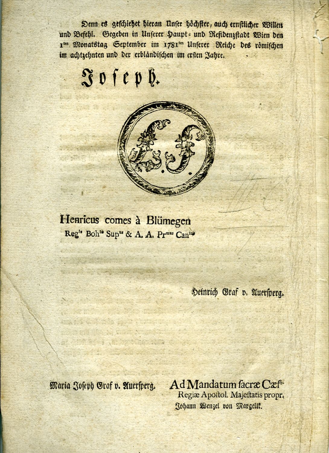 Wir Joseph der Zweyte, von Gottes Gnaden erwählter Römischer Kaiser, .... Entbieten Unseren gesamten Beamten, Ortsrichten, Geschwornen und übrigen Unterthanen in Böhmen, Galizien, Lodomerien, Mähren, .... wie nach Wie über die Art, und Weise, wie die Beschwerden, und Strittigkeiten der Unterhanen gegen ihre Obrigkeiten behandelt, und wie beede Theile ihr vermeintliches wechselseitiges Recht bey Unseren Kreisämten, Länderstellen, und endlich bey Uns selbst zu suchen befugt sind; Unsern ernstlichen Willen, und Befehl zur allgemeinen Richtschnur, und gehorsamsten Nachachtung in folgenden gnädigst kund gemachet haben wollen.