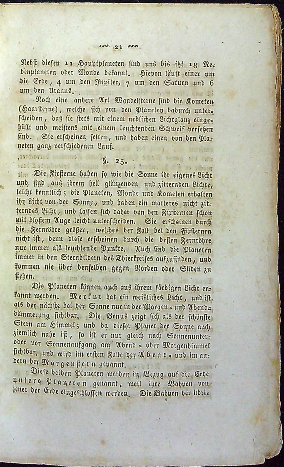 Dobová obálka z tragantového papíru, ve hřbetu potrhaná a v horní jeho části pap. pokryv chybí, n a přední straně obálky při vnitřním horním okraji pap. štítek, knižní blok neoříznutý, papír místy zahnědlý a při vějším okraji lehce roztřepený.