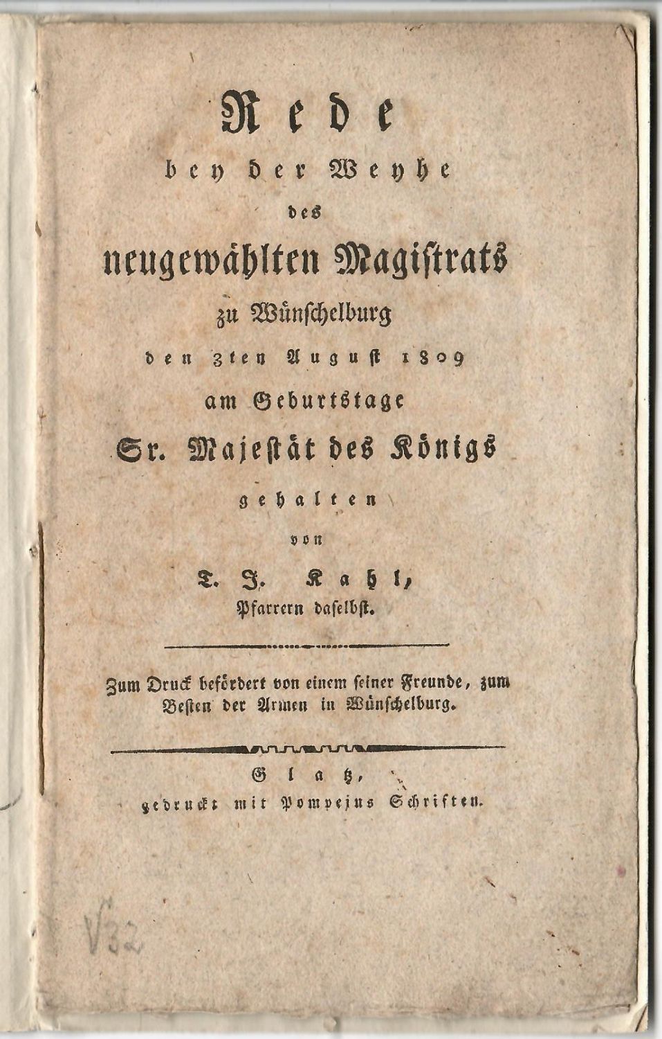 Rede bey der Weyhe des neugewählten Magistrats zu Wünschelburg den 3ten August 1809 am Geburtstage Sr. Majestät des Königs gehalten von .......