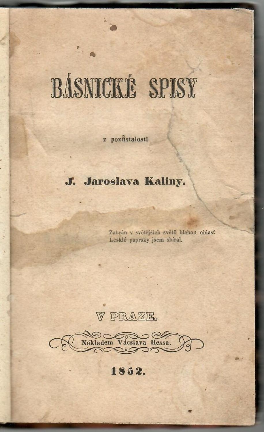 Josef Jaroslav Kalina (9.11. 1816 Haida, Nový Bor - 22.6. 1847 Praha), básník, literární a přírodní vědec, filosof, obrozenec a filolog (krom slovanských jazyků, studoval i hebrejštinu, překládal z němčiny a angličtiny). Mezi jeho přátele patřili Karel Slavoj Amerling se kterým se podíleli na projektu školy Budeč a Josef Václav Frič. Proslul svým bohémským životem, jeden čas bydlel v sudu vystlaném senem na Karlově náměstí, kvůli jeho nezměrnému pití se nakonec od něj odvrátily obě mecenášky, kterým básníkův bratr knihu dedikoval.