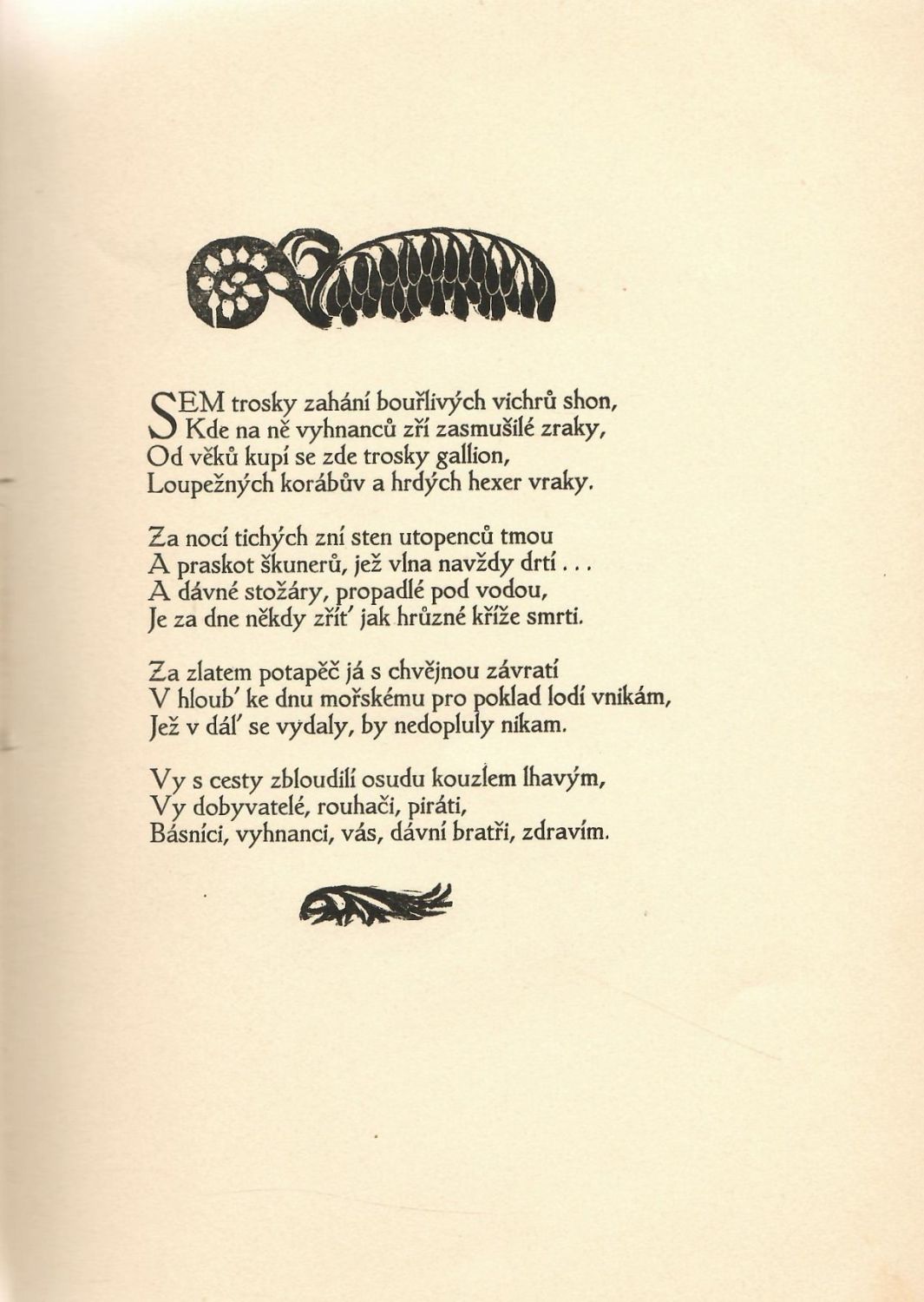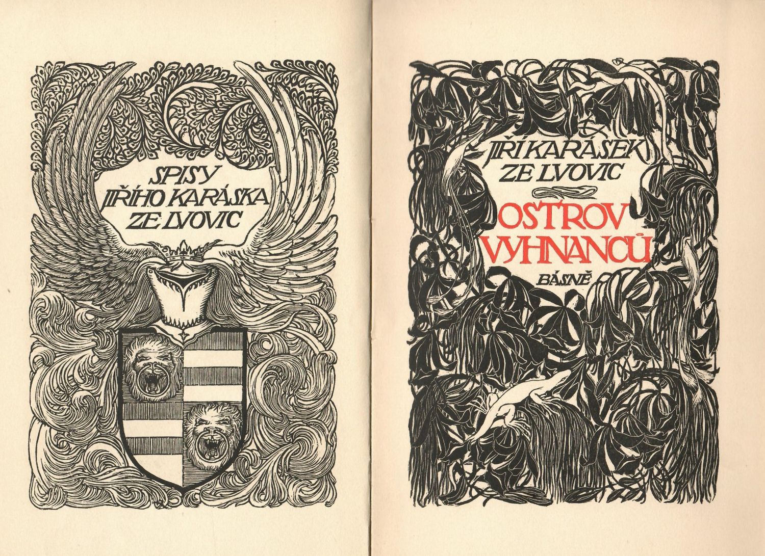 Dvoubarevně tištěný titulní list, názvy básní tištěné versálkami, tučně tištěné versálky ve výši 2 řádků, upravil F Kobliha.