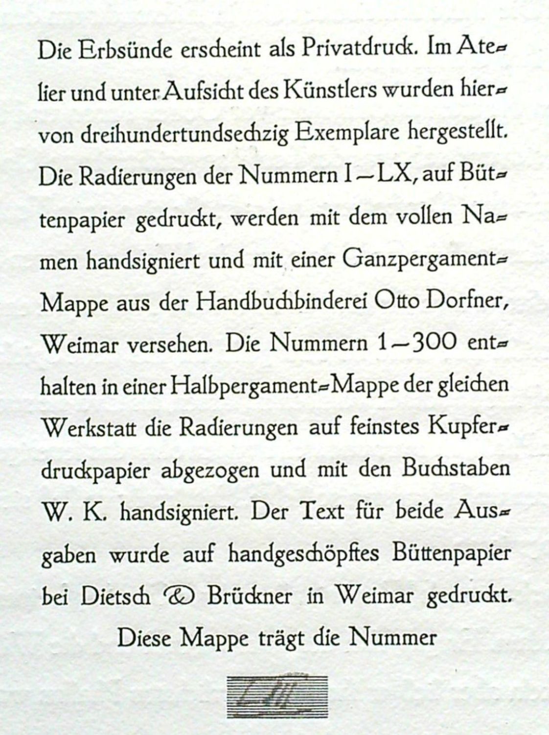 Exemplář č. 53 z 60 výtisků přednostního vydání římsky číslovaného, tištěného na ruční papír, ve kterém jsou všechny lepty autorem podepsány a vloženy v původním pergamenovém pouzdře z dílny knihaře Otto Dorfnera z Výmaru. (Krom přednostního vydání vyšlo ještě 300 výtisků tištěných na měditiskovém papíře s grafickými listy autorem signovanými pouze monogramem a v polopergamenovém pouzdře).