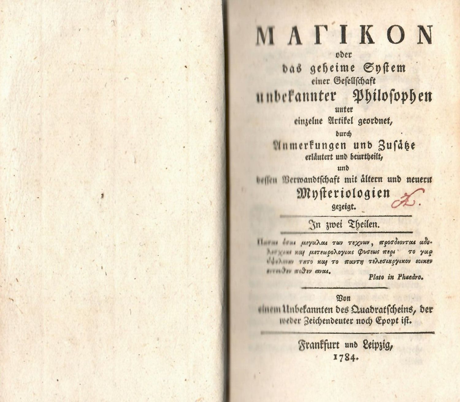 MAGIKON (řecky) oder das geheime System einer Gesselchaft unbekannter Philosophewn unter einzelne Artikel geordnet durch Anmerkungen und Zusätze erläutert und beurtheilt, und dessen Verwandtschaft mit ältern und neuern Mysteriologien gezeigt. 2 Theilen