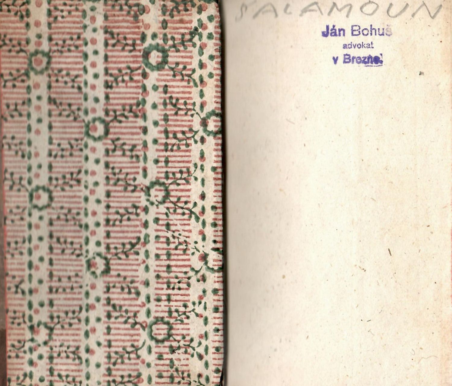 Dobová vazba s kartonovými deskami potaženými olejovým papírem, kožený hřbet a nárožnice, ve hřbetu 5 vazů, ve druhém poli původní vínově červený kožený štítek s tlačeným a zlaceným názvem, v poli třetím zelený s dokončením názvu, v ostatních polích tlačený a zlacený rostlinný ornament, červeně barvené ořízky, na přídeštích dobový škrobový papír s ornamentem. Na přední předsádce razítko jednoho z předchozích vlastníků "Ján Bohuš advokát v Brezne", nad ním a na zadní předsádce podpis tužkou posledního vlastníka, grafika Jiřího Šalamouna z jehož knihovny byla kniha zakoupena. Vazba místy lehce ohmataná.