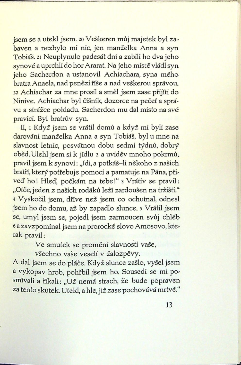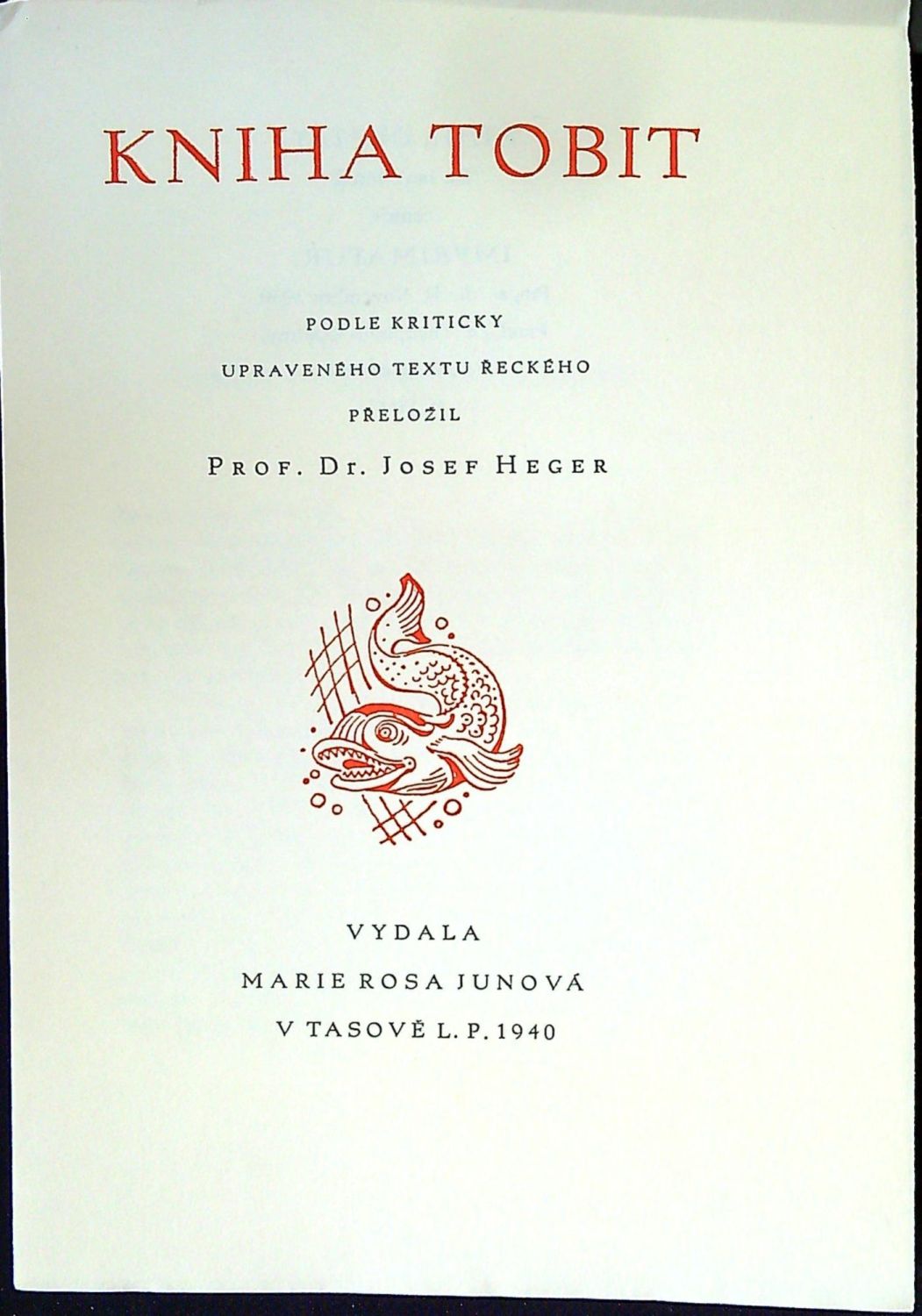 Podle kriticky upraveného textu řeckého přeložil a poznámkami doprovodil prof. Dr. Josef Heger. Mystický výklad knihy Tobit podle vidění Ctihodné Anny Kateřiny Emmerichové přeložil P. Matěj Fencl a Slovo Svatého Bonaventury o Tobiášovi z Římského Breviáře přeložil Jakub Deml. Dvoubarevný tisk, kniha byla vydána k osmému výročí smrti Pavly Kytlicové. Původní pap. obálka, knižní blok nerozřezaný.