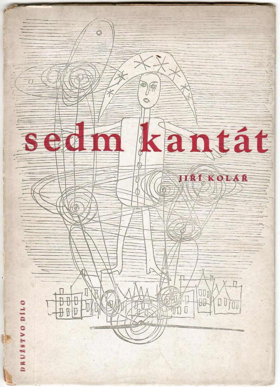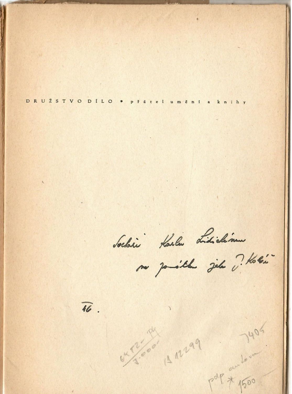 Původní pap. obálka s ilustrací Fr. Hudečka na přední straně obálky, stejná ilustrace ve frontispisu, obálka mírně zašpiněná, ve hřbetu odřená a při jeho spodním okraji natržená. Na patitulu rkp. dedikace: "Sochaři Karlu Lidickému na památku jeho J. Kolář.