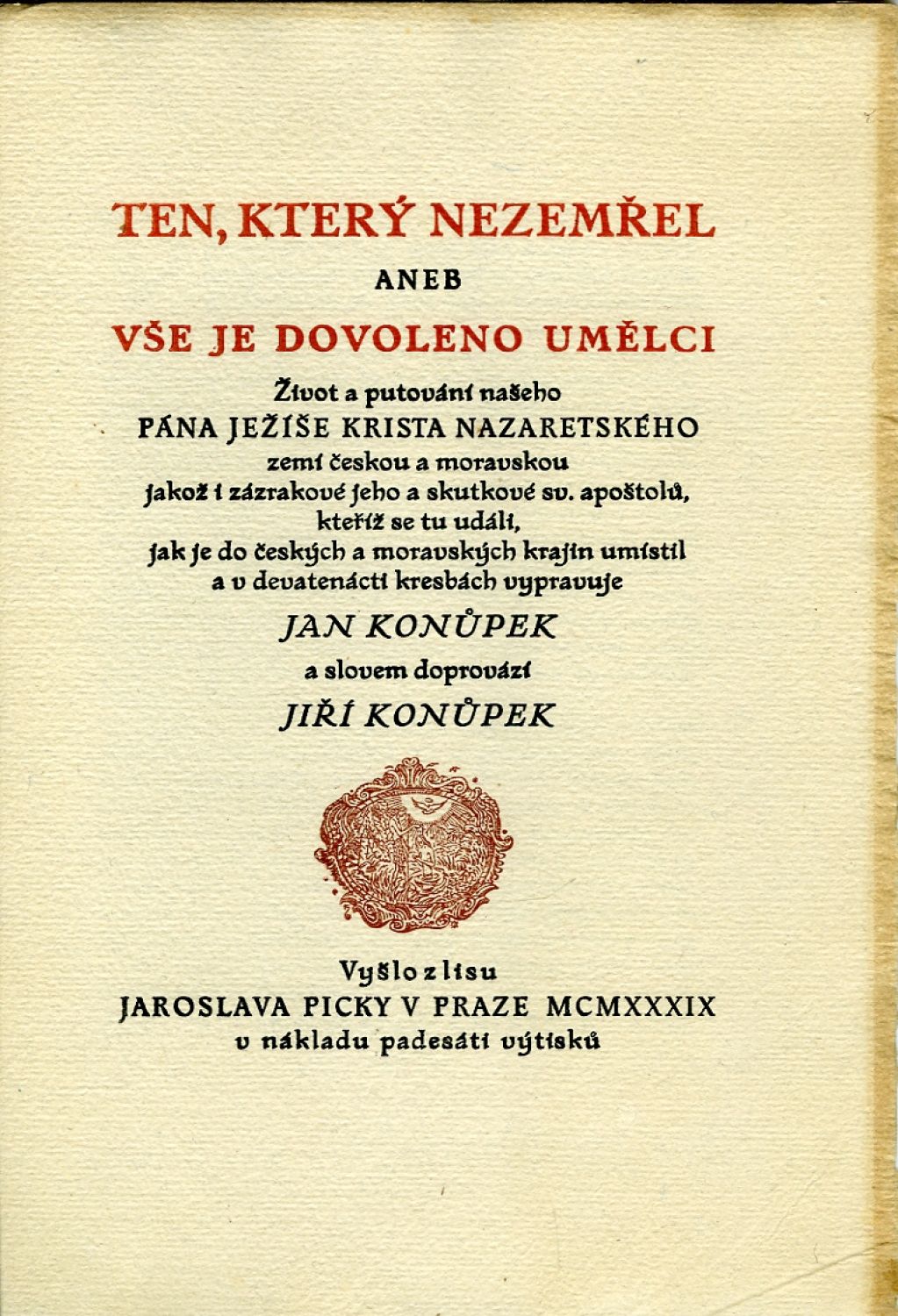 Ten, který nezemřel aneb vše je dovoleno umělci. Život a putování našeho pána Ježíše Krista Nazaretského zemí českou a moravskou jakož i zázrakové jeho a skutkové sv. apoštolů, kteříž se tu událi, jak je do českých a moravských krajin umístil a v devatenácti kresbách vypravuje Jan Konůpek a slovem doprovází Jiří Konůpek.