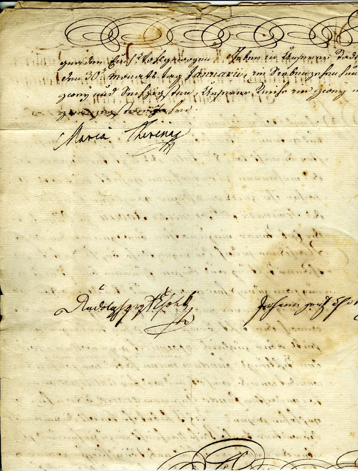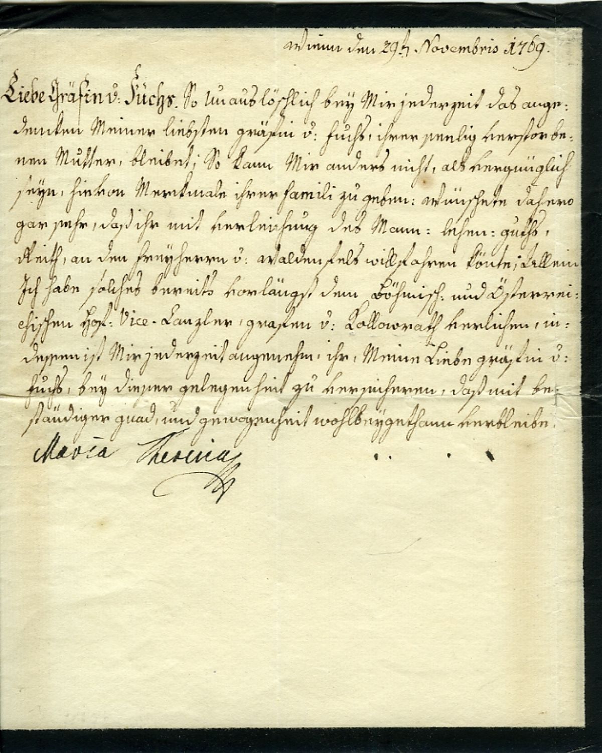 10) MARIE TEREZIE (1717-1780), královna česká 1740-1780. Kondolenční list Amálii hraběnce Fuchs von Limbach psaný německy po jedné straně smutečně orámovaného dvoulistu 230 x 185 mm, datovaný 29.11.1769, vlevo dole podpis. Obálka s adresou a smuteční pečetí dochována. + Rukopis psaný německy perem po třech stranách přeloženého listu 365 x 465 mm, adresovaný moravské dvorské radě v Brně, datovaný 7.2.1762 a panovnicí podepsaný, pod datem suchá pečeť.