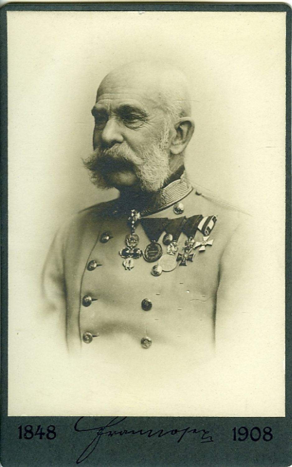 15) FRANTIŠEK JOSEF I. (1830-1916), král český 1848-1916. Zpráva psaná německy na první straně dvoulistu 213 x 175 mm, císařem podepsaná uprostřed pod textem. + Zpráva psaná německy na první straně dvoulistu 217 x 142 mm, císařem podepsaná uprostřed pod textem. + Královské poselství zemskému sněmu z 12.9.1871: vícebarevný tisk v ozdobném rámu vydaný nákladem vlastním a tiskem J. Schreibra a spol. v Kolíně. + Dopis psaný latinsky černým perem na první straně dvoulistu 320 x 205 mm, datovaný ve Vídni 31.1.1884, podpis císařův uprostřed dole: gratulace adresovaná arcivévodovi Friedrichovi, vévodovi z Teschen, a jeho ženě Isabele princezně z Croÿ, k narození jejich dcery Natalie Marie Theresie. + Telegram císaři od arcivévody Ferdinanda, podaný 24.4.1871 v 7.00 a přijatý v Schönbrunnu v 7.20; na líci krátké sdělení Ferdinandovo s podpisem, na rubu tužkou podepsaný přípis císařův. + Jmenování Julia Pojmana do rytířského stavu: předtištěný dekret 535 x 725 mm s kaligraficky doplněnými údaji, datovaný 30.11.1908 ve Vídni, vlevo dole podpis císařův, uprostřed dole císařská suchá pečeť, vpravo dole stvrzující podpis kancléře. + Pamětní fotografie k 60. výročí vlády císaře s jeho portrétem. + Dvě fotoreprodukce portrétů císaře a jeho manželky Alžběty Bavorské (Sissi), podle obrazů Arpáda Koppaye zhotovilo nakladatelství R. Lechner (Wilh. Müller) ve Vídni r. 1898. + Smuteční oznámení městské rady na Smíchově z 22.11.1916 o skonu císaře. + Smuteční oznámení v Národní politice. + Pozvánka na smuteční slavnost konanou 4.12.1916 ve velké aule Karolina a pořádanou rektorem a akademickým senátem University Karlo-Ferdinandovy. + "František Josef I.", řeč přednesená na smuteční slavnosti prof. Josefem Pekařem; nákladem Akademického senátu, 14 tištěných stran. + "Allerhöchstes Befehlsschreiben" ministru války ze 17.2.1915; tisk Dr. Rudolf Junk, Vídeň. + Fotoportrét císaře od dvorního fotografa E. Biebera v Berlíně. + Národní politika z 11.9.1898, věnovaná zavraždění císařovny Alžběty. + "Wýjew citů wěrných Čechů na přiwítanou do Prahy nejjasnějších pánů, pánů: Františka Josefa, Ferdinanda Maxmiliana a Karla Ludvíka, arciknížat rakouských, podáno dne 25. září 1847 we jménu měšťanstva pražského od Besedy Měšťanské". Praha, c. k. dworní knihtiskárna synů B. Haase, 1847. + "Hymna národní. (Dle nápěvu Haydnova)". Praha, tisk synové B. Haase, 1854. + Tištěné německo-české sdělení nejvyššího purkrabího hraběte Stadiona o jmenování Františka Josefa místovladařem v Čechách z 5.4.1848. + "Český východ" č. 37 z r. 1896 s úvodním císařovým provoláním určeným "Sněmu Našeho království Českého". + Obálka dopisu s císařskou pečetí.